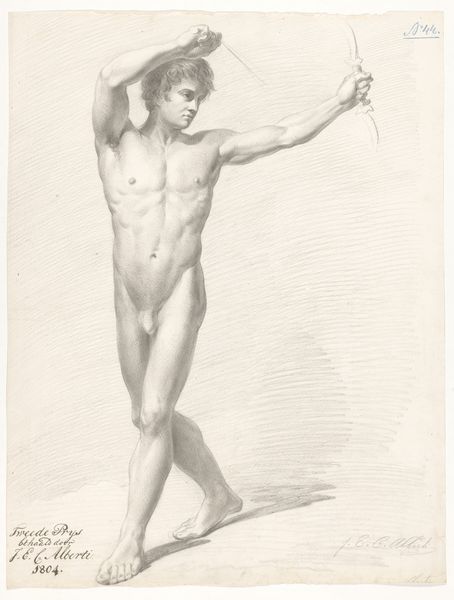 Curator: This is "Standing Naked Man with Arms Folded Around His Head," an engraving by Louis Marin Bonnet dating from between 1769 and 1790. It’s currently held at the Rijksmuseum. Editor: The image projects a profound sense of inward suffering, or perhaps introspection, doesn't it? The subject’s posture conveys an almost unbearable weight. Curator: Observe how the artist masterfully employs line to define form. The subject's musculature, rendered in precise detail, exemplifies the Neoclassical obsession with idealised human anatomy. See how the hatching and cross-hatching create a tonal range despite the print’s limited palette? Editor: It's compelling to consider how the white, Western male body is represented. The positioning, with head in hands, carries the weight of history--a representation of torment that often gets placed onto figures outside the realm of "pure" and "noble" humanity, particularly through religious representation and myth. Curator: But isn't that to ignore the aesthetic achievement? Bonnet is playing with conventions of form and posture in Academic Art, channeling the canon for his audience. There’s also a raw, immediate quality because he is foregrounding classical-realism that suggests the figure isn't allegorical or mythological but is indeed present. Editor: To what extent can one ignore the socio-political context from which these standards of the “ideal” emerged? Whose bodies have historically been deemed worthy of such careful study, of idealisation? By obscuring his own gaze, is Bonnet acknowledging art’s failure to resolve the problems of the world? Curator: You bring a lot to unpack there, and while art certainly never resolves all human suffering, I appreciate Bonnet's emphasis on the pure, unadulterated essence of the human form. It allows me to feel a connection to something eternal and fundamentally human in its simplicity. Editor: Perhaps what resonates most with me is how the work compels us to question what gets valorised, and how we engage with visual art to dismantle those narratives rather than continue reproducing them.