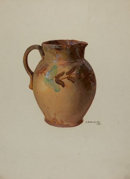Editor: This is Eugene Shellady's "Jar," created in 1936, and rendered in watercolor and colored pencil. It feels oddly formal for something so domestic. What do you make of it? Curator: The political iconography is hard to ignore, isn't it? In the 1930s, craft took on new cultural significance. Think about the Federal Art Project – part of the New Deal – which promoted distinctly American art forms, celebrating regional crafts and traditions, and even putting artists to work to create public artworks, especially murals. Editor: So, the jar isn’t just a jar? Curator: Not at all. Notice the eagle, and what seems to be an inscription. Consider the Depression era, and a resurgence of nationalist sentiments. The humble ceramic object is being elevated, imbued with a sense of national identity. Does this drawing, therefore, act as documentation? As a tribute? Or perhaps a critique? Editor: It’s interesting to think of this being created alongside those murals. It’s almost as if Shellady is making a miniature, portable monument to national ideals. The eagle motif makes sense now. Curator: Precisely! It's a quiet assertion of cultural values through everyday objects. One also has to think about exhibition practices. Was this created for a specific showcase, or competition? Editor: I see it now! The jar as a silent statement within a larger social narrative. Thanks for broadening my perspective! Curator: It's a privilege. There’s always so much to consider, thinking through the art and social histories embedded within one little “Jar.”