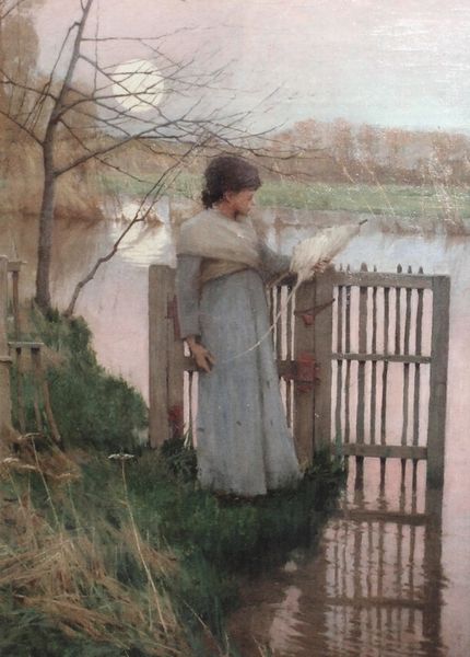 Pekka Halonen created this serene oil painting, "Tyttö Rannalla," around 1901. The subdued palette, dominated by greens and whites, is deftly applied with visible brushstrokes. This technique, common in the late 19th century, allowed artists to capture the fleeting effects of light and atmosphere, to represent the world in a way that was radically different from the polished surfaces of earlier academic painting. The young woman's simple white dress also speaks to the way modern life was infiltrating even relatively rural contexts. Machine-made textiles were becoming more available, and influencing even the clothing of everyday people. Halonen's work reflects a broader social movement toward appreciating the dignity of labor and the beauty of the natural world. While oil painting had long been associated with wealth and patronage, artists like Halonen sought to democratize the medium, using it to depict the lives and landscapes of ordinary people. By focusing on materials, making, and context, we can begin to understand how traditional art forms were used to engage with wider social issues of labor, politics, and consumption, challenging traditional distinctions between fine art and craft.