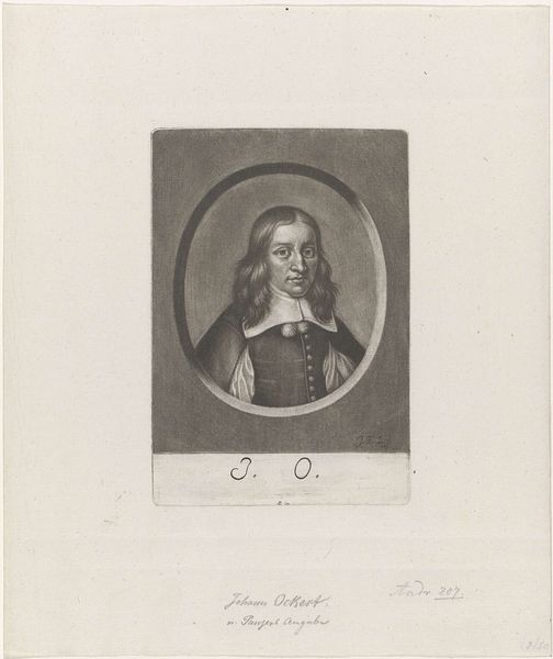 Curator: Oh, I do love stumbling across an artist representing another artist! There's something beautifully self-referential about it. Editor: Agreed. This is "Portret van de schilder Hermanus van Brussel," dating from around 1860 to 1900. It's an etching. Curator: Etching, yes! I adore the texture! The detail! Tell me, does anyone else find themselves mesmerized by neck ruffles? And what an intriguing gaze! Almost… quizzical? As if he's challenging us, saying "Well, what do you make of *me*?" Editor: The work does present a particular image of masculinity during this period. He’s self-assured, poised, every inch the professional… Curator: But look at what's lurking behind him! Is that a canvas? An easel? Oh, but I can’t shake this feeling he’s about to share some juicy gossip from the art world! Or maybe he is merely longing for a time he could paint landscapes en plein air rather than attend another stuffy salon! Editor: It speaks to the growing professionalization of the art world and what was being created simultaneously with systems of patronage. The presence of these creative tools definitely signifies Hermanus van Brussel's professional status. Curator: Exactly! And do you find his posture, slightly turned, to have any bearing on class dynamics? Because it doesn't exactly come across as nonchalant... more posed, almost as if saying: 'Look at the artistry in both of our trades!' Editor: Perhaps it suggests both pride and a certain defensiveness? Being both the subject and the artist's peer… The artistic field during this time definitely carried weight and value judgments regarding occupation and position. Curator: A truly captivating etching… One gets quite a look at life behind those brushes... Or, I suppose, etching tools here. Editor: Yes, It is a powerful look into how class identity and creativity were being constructed.