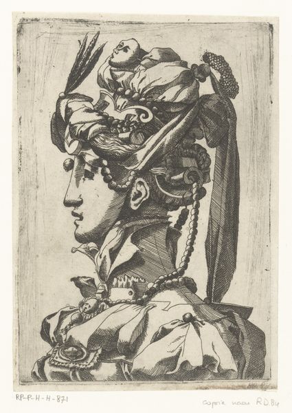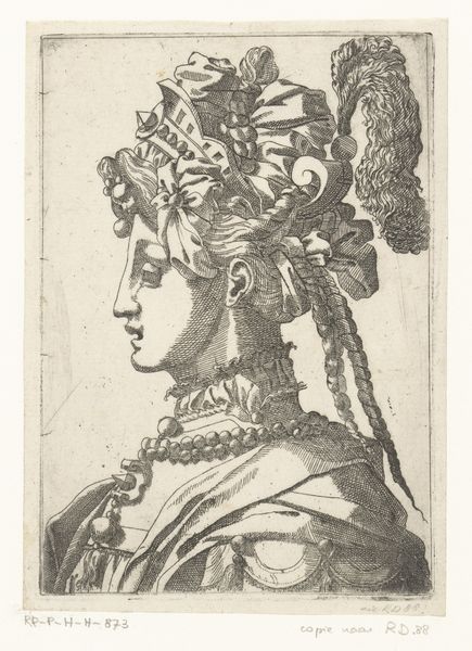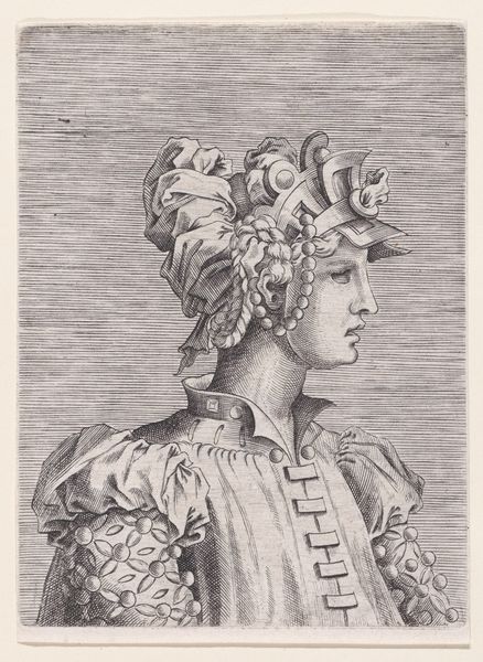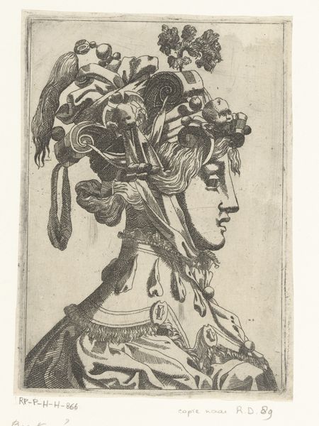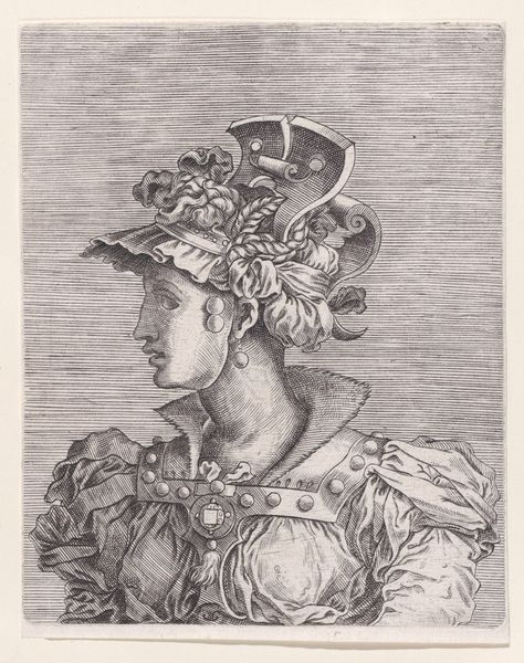 Curator: Look at the opulence rendered in these etched lines. This is "Bust of a Woman Wearing a Fantastic Head-dress and Mask," an engraving made sometime between 1525 and 1600 by René Boyvin. Editor: What strikes me first is the sheer density of adornment. It's overwhelming, almost suffocating. The horizontal hatching creates a strangely oppressive backdrop, further emphasizing the weight of the costume. Curator: Yes, and notice how that dense hatching suggests both form and material—it gives the print depth but also hints at the engraver's deliberate process. It speaks to the hours dedicated to crafting this single image, the labor involved. The image almost fetishizes skilled production. Editor: I'm fascinated by the symbolic language at play here. The woman's headdress is a riot of ribbons, pearls, and braids—but above all, ribbons that recall triumphal wreaths and diadems, alluding to power and status. But what does the mask conceal, and why? What does this enforced vision obscure from the viewer? Curator: Perhaps it points to the artifice of courtly life during the late Renaissance, and also reveals the culture of fashion during this era. Masks were fashionable across Europe. And while Boyvin designed the print, its production suggests a larger workshop practice, implying multiple hands were involved. Editor: Absolutely, and the lion motif emblazoned on her chest seems significant too, don’t you think? Lions often represent courage and nobility but also pride and ferocity. Does that mask hide her true leonine face, or is this just more theatre? The print acts almost as an early fashion plate, codifying trends in elite circles while also performing that visual language. Curator: I agree. And beyond the specific identity, the lion suggests a more general attribute deemed desirable or even necessary for a woman of stature. The circulation of this image, both as a work of art and as a template, speaks volumes. This portrait allows a vision of what women could make possible within these cultures and societies. Editor: In this dance between revelation and concealment, the artwork encourages us to delve deeper into the symbology embedded within its artifice. It almost functions as a cultural artifact, revealing beliefs, status, and aspiration in the late Renaissance period. Curator: I see it similarly—a beautiful synthesis between high art and the skilled labor of reproductive printmaking, a tangible marker of both artistic skill and historical context.