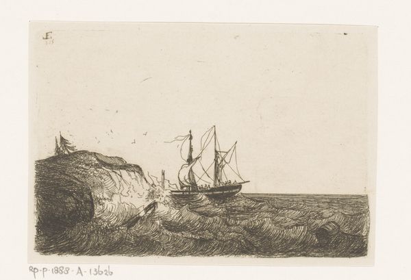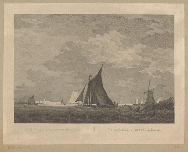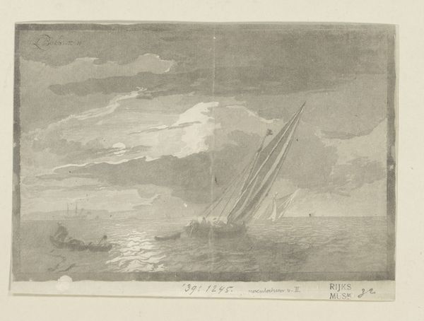 Editor: Here we have Cornelis Brouwer’s "Man met zak op de schouder bij zonsopgang," created between 1779 and 1781. It’s a pencil drawing, currently housed in the Rijksmuseum. There's such a melancholy feel to it; the lone figure on the shore seems weighed down. What strikes you about this piece? Curator: It's compelling how Brouwer utilizes the sunrise not just as a background but as an active element imbuing symbolic meaning. Notice how the figure's silhouette almost blends into the emerging light? The man carrying the bag… consider him as a vessel himself. He is burdened by something. Perhaps the cares and worries carried along his path through life. Does the light suggest any redemption or the dawning of hope? Editor: I hadn't considered the man as a vessel himself; it's more obvious now! I guess I was stuck on the simple image of a laborer setting out. Curator: Consider how landscapes during this period often served as mirrors to the soul, visual poems reflecting inner emotional states. The figure isn’t just a worker, he's us – each of us facing the sunrise, carrying burdens seen and unseen. Even the ship far away can become the image of one's destination that is never really reached. This reflects an experience of the world in a time of political turmoil and societal reevaluation. How does the sea enhance this feeling? Editor: The sea gives a feeling of endlessness... making his journey feel longer, more arduous, perhaps? The image of that sunrise over that body of water almost washes it all away! Curator: Precisely. Brouwer has encapsulated a moment of profound human experience within a seemingly simple scene. By looking closely at what is literally depicted we can enter into cultural memories, long before the present day. Editor: I’ll definitely remember this when I see the sun rise, thank you! I really do have a greater understanding. Curator: And hopefully a sense of how we all carry echoes of the past, within ourselves, too.