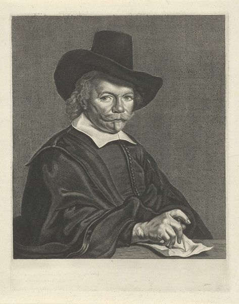 Nicolas Gabriel Dupuis created this print, *Portret van Herman Doomer*, sometime between the late 17th and early 18th centuries. The portrait captures Doomer, identified by his dress as a man of means, with a certain unidealized realism. Dupuis, as a French artist, was influenced by the grand tradition of portraiture, which often served to solidify social status and project authority. Yet, in his rendering of Doomer, there’s a departure from the strictly flattering portrayals common among the elite. Doomer's expression suggests a worldliness and introspection not always seen in the more formal portraits of the era. This print invites us to consider the nuances of identity and representation in art. It asks: How do artists balance the demands of patronage with their own vision? And how do viewers interpret and negotiate the meanings embedded within these images?