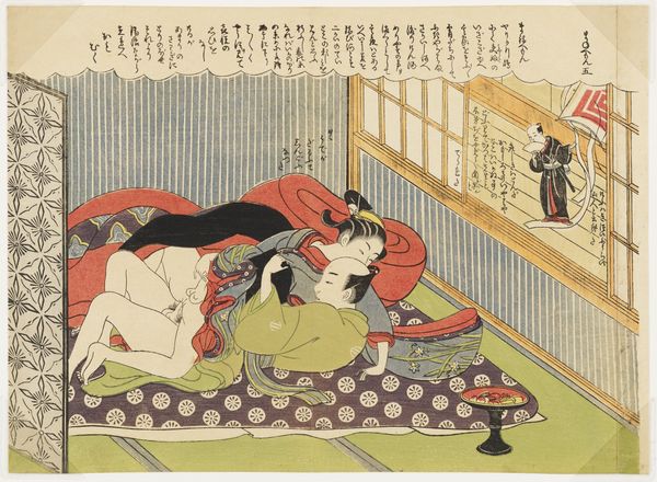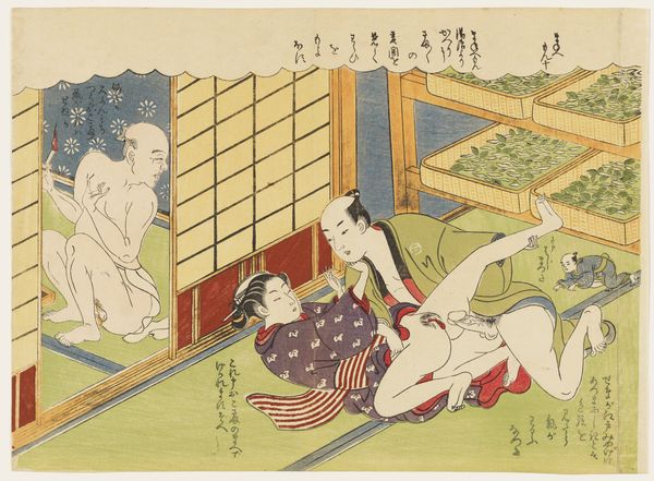 A couple entwined while listening to a blind shamisen player at the Ikaho hot spring in Kozuke Province, at right Mane'emon dries his head after emerging from the bath.