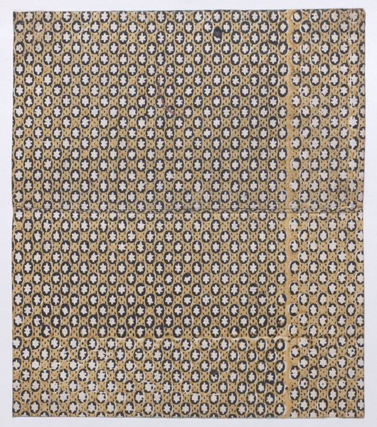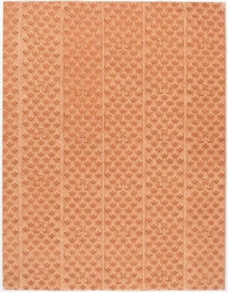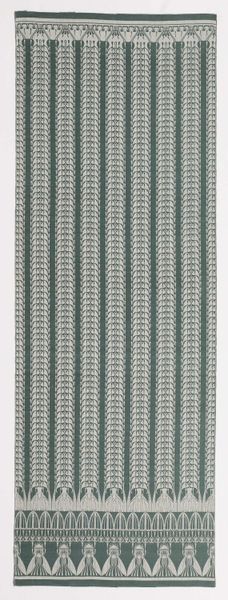 Editor: Here we have Chris Lebeau's textile, "Wandbespanning," created between 1911 and 1915. The repeating patterns have a rather soothing, almost meditative quality to me. How do you interpret this work, considering its time and the imagery? Curator: Indeed. Notice the verticality, the way the patterns ascend like growing things. For me, the repeated motifs suggest an aspiration towards nature, typical of the Art Nouveau, but with a restrained hand. It reminds me of ancient Egyptian art, particularly the lotus and papyrus motifs used in columns and friezes. What emotional associations might these historical symbols evoke in a viewer of the time, do you think? Editor: A connection to nature and maybe a sense of timeless beauty? Curator: Precisely. The subtle repetition almost works as a type of cultural echo, reminding us of these enduring images across millennia, adapted into a contemporary design for interior spaces. There’s a connection here between domesticity, art, and a sense of cultural memory. Do you think that relationship stands true today? Editor: That’s a good point. The connection is more subtle these days, isn't it? It's almost hidden within the layers of symbolism. I learned a lot about symbols as cultural artifacts and cultural memory. Curator: Excellent! We all did!