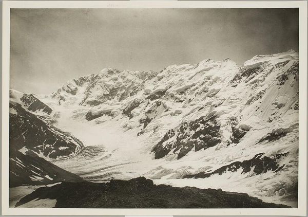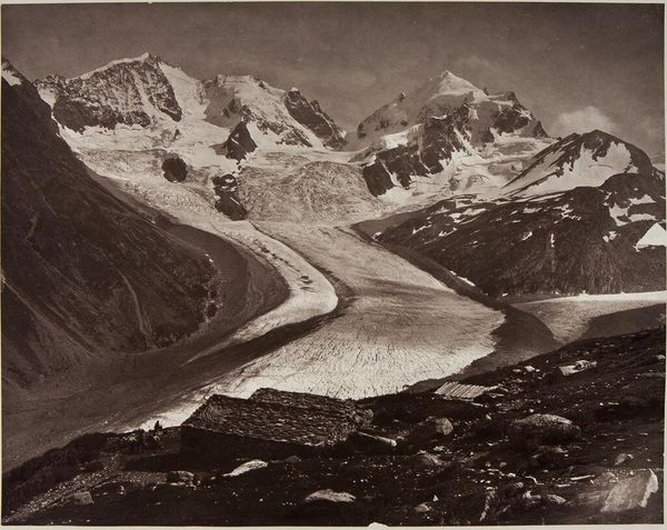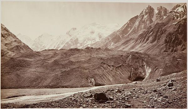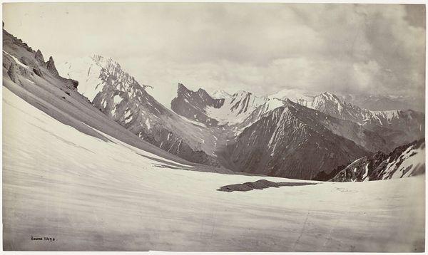 Curator: This photograph, by Samuel Bourne, captures The Neela Pass at the Head of the Buspa Valley. Editor: It feels…vast, and terribly lonely. The scale is just immense, with those tiny figures dwarfed by the landscape. Curator: Bourne made several trips to India in the 1860s, documenting the landscape with a distinctly colonial gaze. He was celebrated for his technical skill. Editor: Colonial gaze or not, he certainly captured the sheer drama. It’s almost monochrome, but that gives it such an austere, timeless quality. Curator: Precisely. These images were often used to reinforce the Empire's power, suggesting the unyielding nature of British presence. Editor: I see that, but I also see the sublime in nature's indifference, you know? These mountains don't care about empires. Curator: A fair point. It shows the power of images to resonate differently across time. Editor: Absolutely. I'm still shivering just looking at it.