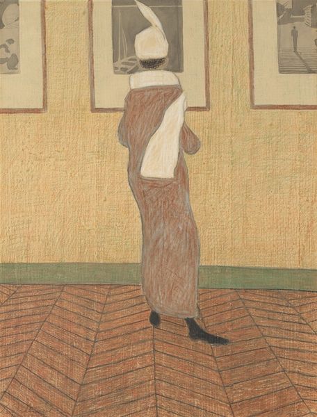 Curator: This is Édouard Vuillard's "The Child at the Door," painted between 1891 and 1892. It offers a glimpse into an intimate, domestic scene. Editor: It immediately strikes me as melancholic. The muted colors and shadowy doorway evoke a sense of quiet solitude. Is that child carrying a rather large piece of paper? Curator: Indeed. Notice how Vuillard employs watercolor to create soft, diffused forms. The chromatic range, though subdued, plays with the juxtaposition of cool and warm tones, thus creating depth in this interior scene. The wallpaper is also significant. Editor: The materiality of this watercolor—its transparency and lightness—contrast starkly with the density of the paint suggesting a domestic craft perhaps relegated as woman's work against a monumental piece made by male counterparts for gallery walls. Are we really that surprised to find wallpaper? It reads like any contemporary print. Curator: I find that you raise a most interesting idea in viewing this as "woman's work." Yet I'd also urge to consider Vuillard's choice to integrate surface design so completely. Here, the pictorial field becomes almost uniform; pattern and figure become difficult to differentiate. Editor: Interesting take! Vuillard certainly had a canny understanding of domestic labor, often assigned and deemed less "important," less 'worthy' of traditional galleries and exhibition. That door feels uninviting. I wonder if that patterned wallpaper Vuillard chose for his backgrounds might've seemed progressive at that moment... like "democratization" writ large. Curator: I interpret it through an almost psychological lens: The child at the threshold becomes emblematic of nascent consciousness, stepping out into the world with apprehension, almost as if afraid to "exit stage left." Her pallid skin against the rich, dark hues create quite a study. Editor: Seeing it this way, his layering reminds me that daily life involves labor: planning meals, creating welcoming spaces, all things, "unseen." So that watercolor feels less ethereal and light as the weight it is, an insight, both beautiful and daunting!