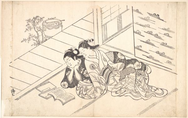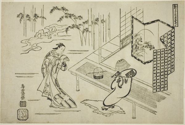 Okumura Masanobu created this woodblock print, Yoshitsune (Ushiwaka) and Princess Joruri, in Japan in the first half of the 18th century. It depicts a scene from a puppet play, reflecting the popularity of this theatrical form in the Edo period. Looking closely, we see Yoshitsune, a renowned military commander, and Princess Joruri, known for her beauty and musical talent. The print highlights the cultural associations of the time, where accomplishments in the arts and military prowess were equally valued. Note Yoshitsune’s drum and Princess Joruri playing the Koto, a Japanese stringed instrument, together expressing the harmony between martial and artistic pursuits. The setting suggests an interior space, perhaps a room in a palace or a wealthy household. The image speaks to the cultural and social life of the time, where theatre and music provided entertainment. To fully understand this artwork, one must delve into the history of Japanese theatre, the social status of artists, and the cultural values of the Edo period. Research in historical archives, theatre records, and studies of Japanese art history will shed more light on its significance.