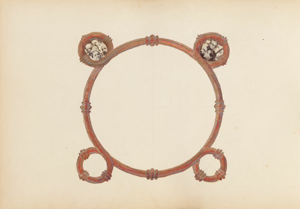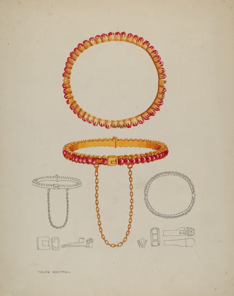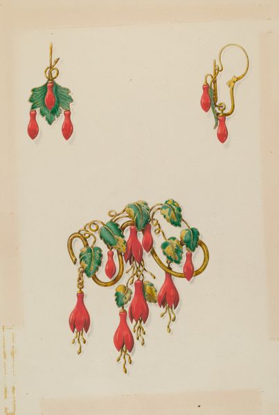 Editor: So, this watercolor and ink drawing on paper is called "Horsehair Jewelry," made around 1937 by William High. It depicts a matching set of jewelry—a brooch, bracelet, and earrings—in a uniform, vibrant red. It strikes me as being quite ornate, almost decorative. How do you interpret this work? Curator: What catches my eye is the title versus what we're actually seeing. "Horsehair Jewelry" suggests the material is literally horsehair. But this drawing, rendered so meticulously, seems to propose an *idea* of horsehair jewelry, not necessarily jewelry made from it. Consider the period—1937, during the Depression. Was there a fascination with inexpensive or repurposed materials like horsehair as jewelry, and did High intend to elevate these materials through his art? Editor: That’s a very interesting point. The precision does seem to elevate it. Do you think the fact that it's a drawing instead of actual jewelry influences the message? Curator: Absolutely. This image functions almost like a design proposal. It is meant for some intended use; consider this perhaps being made available via a local crafts store. Perhaps women are engaging more in the public market at this point in time? Consider what happens to art when everyday, common items or tasks are elevated to "Art" during this period in America? Editor: So, it’s not just about the individual artistry but how it fits into the social landscape of its time. Curator: Precisely. Think about who would be buying this “art” in this area, at this specific time? What values would this proposed product suggest? High’s drawing becomes a valuable social document and a design project. Editor: I hadn't considered that – I was focused on its visual qualities, but its function within society makes it much more interesting. Curator: Exactly. Art exists in a larger conversation, a context shaped by culture and societal needs. Editor: Thanks! It makes me think about art in a different way. I appreciate you looking beyond face value to analyze the context surrounding this. Curator: It’s crucial to understanding its significance. Never forget that context!