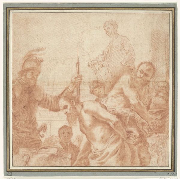 Editor: Here we have "Ruit met de Bruiloft te Kana," or "Panel with the Wedding at Cana," a print by Jan Swart van Groningen from around 1540, rendered in engraving. I'm struck by how the figures dominate the composition, almost overwhelming the architectural background. What stands out to you when you examine it? Curator: Formally, the composition hinges on a dynamic interplay between foreground and background, particularly how the large water jugs interrupt the architectural space behind. Notice the artist's rendering of depth. What we might read as awkward, even comical, can be understood through an engagement with northern Mannerist conventions. Do you see how the figures are arranged almost like a stage set? Editor: Yes, the overlapping creates a crowded feeling. Is this emphasis on the figures typical for the time period? Curator: In this instance, certainly. By prioritizing figuration over strict adherence to perspectival accuracy, Swart van Groningen creates a distinctly stylized depiction. Consider how the color palette, restricted to ochre tones, flattens the pictorial space further, emphasizing the graphic quality inherent to the print medium. Are you perceiving any emotional or narrative consequences arising from the stylistic devices? Editor: It lends it an almost dreamlike feel, or like looking at a play. I'm interested in those big jars in the foreground now. Curator: Indeed, they draw our eye. The foreground becomes an active pictorial space that challenges conventional depth. Thinking about this piece formalistically really makes you consider how an artist manipulates line and space to guide our attention, doesn't it? Editor: Absolutely, focusing on those elements reveals so much. I definitely have a new appreciation for the artist's choices and the effect they create.