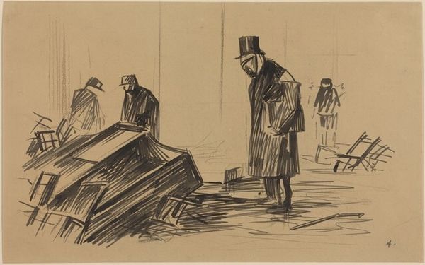 Jean-Louis Forain made this drawing, called ‘Bredouilles. l’Equipage d’un Zeppelin,’ with what looks like crayon or charcoal, and it’s all about the process of observation and quick, expressive mark-making. What grabs me is the way he uses texture to create a sense of depth. Look at the figure in the center, shrouded in shadow, the strokes are dense, almost frantic, conveying a feeling of unease. Then, see how the figures fade into the background with lighter, sketchier lines, like ghostly apparitions? The way Forain manipulates the pressure of his crayon, building up the darks and leaving areas untouched, it’s like he’s sculpting with light and shadow. I can't help but think of Daumier, both in their subject matter and their commitment to capturing the raw, human experience. Like Daumier, Forain’s work reminds us that art is not just about beauty, it’s about bearing witness and inviting us to see the world in all its messy, contradictory glory.