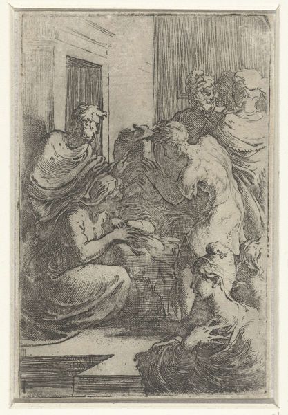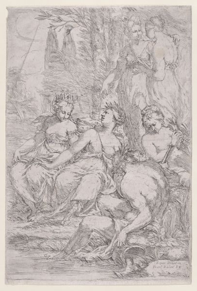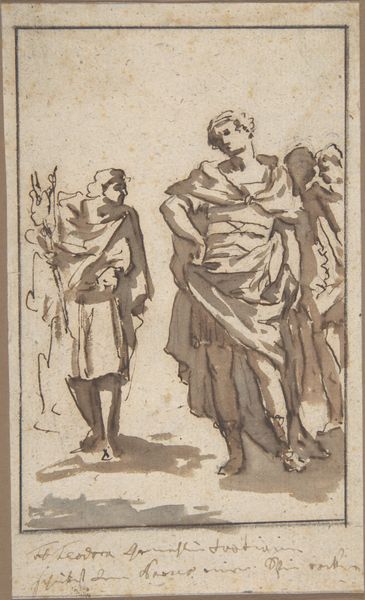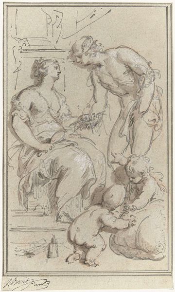 Jacob de Wit made this drawing, "Justice and Kindness," probably in the 1730s, using pen and brown ink, brush and gray wash, with white opaque watercolor on paper. The artist used traditional drawing materials to create a preparatory sketch. The gray wash creates tonal variations, while the white watercolor highlights forms. The artist has used thin lines and broad strokes to create this sketch. It is full of movement and energy; it is not a static depiction. Here, we can see De Wit experimenting with the expressive qualities of the ink. Look at the scales and rods near the feet of Lady Justice. The sketch demonstrates the artist's command of materials and methods and would have been essential to producing a successful painting or fresco. The drawing's loose and informal approach challenges traditional distinctions between fine art and craft. The artist's process is essential to understanding the artwork's full meaning.