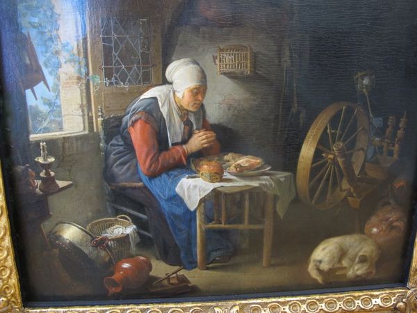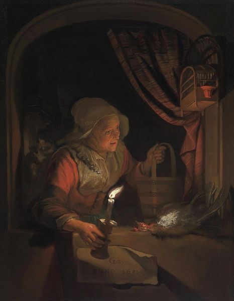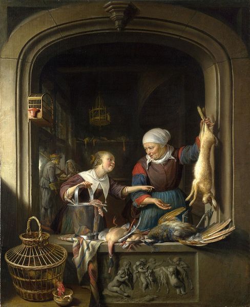 Curator: So, this is thought to be Gerrit Dou’s "Herring Seller and Boy," a wonderful example of Dutch Golden Age painting rendered in oil. Editor: My first thought is, "cozy chaos." It's like walking into a bustling kitchen where life, in all its fragrant, slightly overwhelming glory, is happening. You can almost smell the brine. Curator: Absolutely. The work encapsulates several classic visual cues from this period, including the "niche" composition in which the figures are framed within an architectural element, but the layers of symbolic weight here are worth further unpacking. Editor: Do tell! My iconographic knowledge needs a serious herring-sized boost. Curator: Consider, for example, the way the fish itself functions. Throughout art history, fish imagery is strongly tied to Christian symbology as well as broader ideas related to sustenance and bounty, the bounty and the hardships that surround the provisioning of sustenance are all key. Hanging herbs and the carefully arranged vegetables carry similar connotations tied to the "daily bread." Editor: True, and it’s interesting that Dou presents these symbols via such grounded, un-idealized figures. The boy’s suspicious glance and the seller’s intense inspection… they suggest a level of financial anxiety lurking beneath the abundance. Makes it all so…human. Curator: Indeed. Dutch genre painting, in its golden age, excelled in capturing those nuances of ordinary life, of ordinary labor, but also embedded morality into many everyday scenes through its treatment of its subjects. Editor: So beyond the surface of daily hustle, the picture becomes something of a sermon on honest living and diligence? Or perhaps just a visual record of 17th-century anxieties over sustenance. Curator: Exactly. It prompts us to consider how material culture—even something as simple as a fish—can speak volumes about a society's values and worries. Editor: A surprisingly potent little still life, then, simmering beneath that deceptively calm Dutch light. Well, my senses definitely feel enriched after lingering with Dou for a while! Curator: As do mine! It is through repeated encounters and careful examinations that these small domestic settings start echoing with historical complexity.