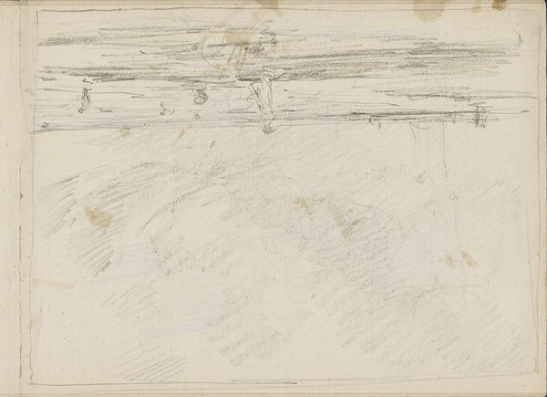 Petrus Johannes Schotel captured this beach scene with ships and figures using graphite and gray wash on paper. The immediacy of these materials suggests it was a sketch, perhaps made on site. The artist's hand is evident in the varying pressure of the graphite, creating depth and shadow. The gray wash adds atmosphere, evoking the dampness of the sea air. Schotel's choice of these accessible, portable materials speaks to a deliberate artistic decision. Unlike the laborious process of oil painting, the quick application of graphite and wash allowed for capturing a fleeting moment. Consider the contrast between the loose sketch and the highly detailed, finished marine paintings that were popular at the time. This work offers a glimpse into the artist's process, revealing an interest in capturing the essence of a scene with minimal means. It reminds us that artistic value isn't solely tied to laborious production or precious materials.