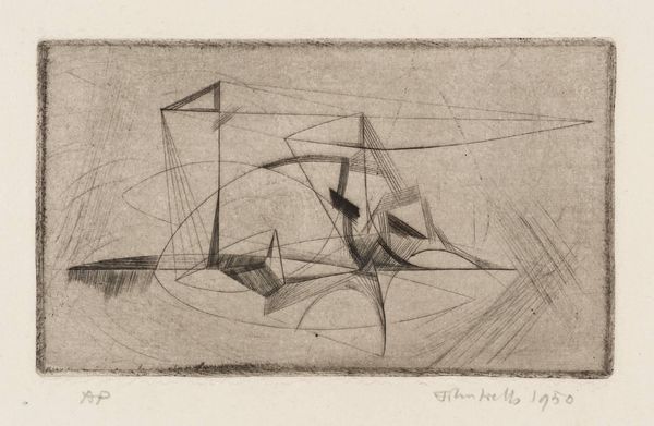 Editor: This untitled ink drawing from 1953 by Ralston Crawford presents such an interesting jumble of geometric forms. There's a striking use of cross-hatching that reminds me a bit of architectural blueprints, yet the shapes feel…incomplete? How do you interpret this work? Curator: What strikes me is how Crawford uses the pen line itself as a carrier of meaning. Lines and hatching can denote shade, depth, but also evoke a kind of industrial or mechanical language. This isn't just about abstracting form; it's about recalling forms that dominate our modern environment. Do you get any sense of location or place from the drawing? Editor: Hmm, maybe… a construction site or perhaps a dockyard? There’s a strong angularity, like metal structures intersecting. The repeated grids create an overwhelming sensation, somewhat unsettling too. Curator: Precisely. The grid is one of the key recurring symbols in modern art. From city planning to the cold, Cartesian coordinates, a world seen as plotted and mechanized. In what ways might this symbolism echo cultural feelings about technology? Editor: Maybe the promise and the dread? The grids speak of human imposition onto a landscape or idea, that imposition becoming quite chaotic and complex here… I appreciate seeing the image now not just as forms on a paper but as a symbol itself. Curator: And remember, symbols aren’t static. Our feelings around the "grid", for instance, will continue evolving, changing how future audiences perceive works like this one. I'm so glad we could unpack its rich and continuous relevance today.