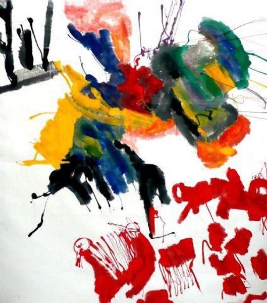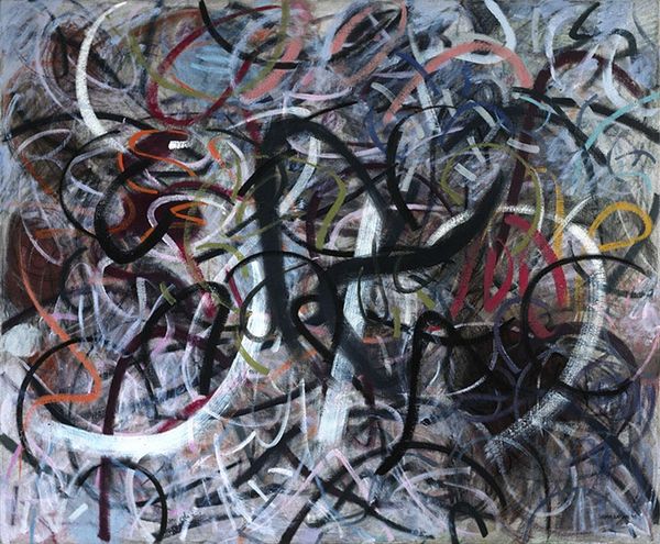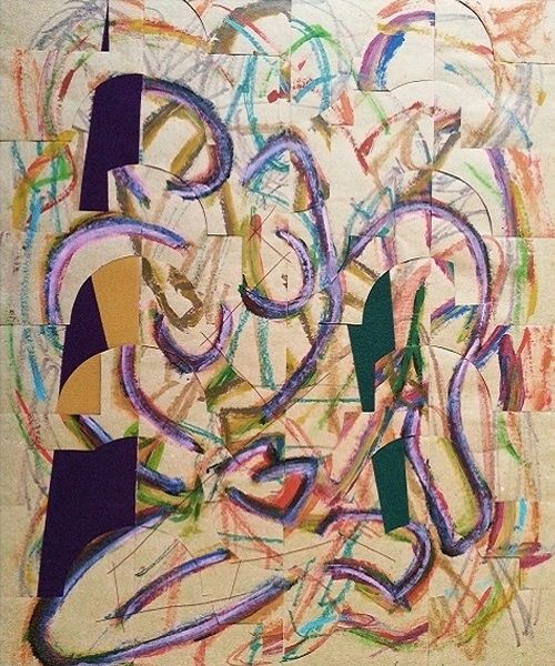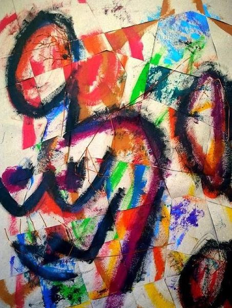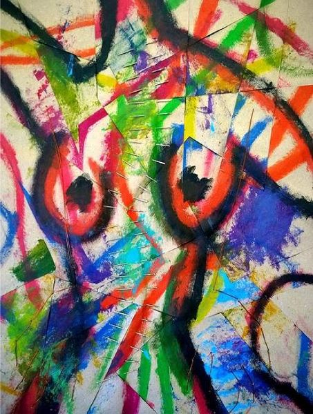 Editor: Rodrigo Franzao's "Substance 1," created in 2015 using mixed media, strikes me as a raw explosion of feeling. It's almost like looking at two figures fighting to emerge from chaos. What's your take on this one? Curator: Ah, a fellow soul gazing into the vibrant mess! For me, it's a delightful clash of raw expression and… fractured vulnerability. Franzao throws down these powerful colours – unapologetic blues, yellows, greens. Feels a bit Fauvist, doesn’t it? – but then, literally fractures the surface. It is on separate paper sheets put together! Like a stained-glass window hit by a rogue thought. Editor: Yeah, I see the 'stained glass' aspect. I didn’t initially, but how it’s put together gives that fractured form feel! Why the breaking apart, you think? Curator: Perhaps it mirrors the figures' internal struggles? The very *substance* being questioned, pulled in different directions. It almost feels like a commentary on how identity is built and shattered, rebuilt with new colours and new textures. What about the expressionistic lines, they feel raw and almost like the line of a seismograph, what do you think? Editor: Now that's a cool thought - like reading someone's inner earthquake on the canvas. Those expressionist lines... the line that separates things is not clean-cut but rather organic...I mean, what separates them is actually similar to what unites them. Curator: Exactly! Almost graffiti-like in its energy, right? I suspect there's something deeply personal bubbling beneath the surface here, a brave kind of revealing, don't you think? Editor: Definitely. Now I see more layers than just colourful chaos. Curator: Beautiful. That's what art does best, changes with a shifted perspective.