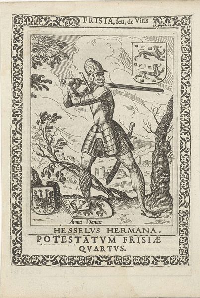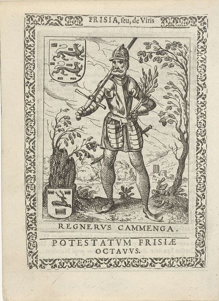 Curator: Here we have a print from between 1618 and 1620, attributed to Pieter Feddes van Harlingen: Igo Galema, fifth Potestaat of Friesland. Editor: Striking! The figure is rendered with such directness, a powerful sense of presence emerges, despite the clear linear nature of the engraving. And what's with the stork? Curator: Let’s delve into the making of this image. Feddes van Harlingen, a notable figure in the Northern Renaissance printmaking scene, employed engraving to depict Igo Galema. The texture achieved through these lines gives the piece a unique dimensionality. Consider also, that prints such as this, had great importance at the time in the spreading of information about rulers and important individuals. Editor: I’m fascinated by the formal elements at play here. Notice the carefully constructed composition, balancing Galema with the stork. The linear patterns create visual interest, and the heraldic devices add another layer of meaning, a type of visual syntax offering insight into identity and power. It's a feast for the eyes in its detail and construction. Curator: And not to forget the cultural context! Galema, though a figure shrouded in myth, represented Frisian identity and resistance. The print served as a vehicle for asserting Frisian history, designed to appeal to the local population of Friesland. The choice to depict him with certain symbolic elements reveals conscious construction of an image of regional heroism. Editor: I agree. Thinking about his pose and gaze, so strong and fixed—everything reinforces the statement about leadership. The detail in his attire is exquisite. One almost feels you could decode his persona layer by layer, by analyzing the lines of his clothes. Curator: Prints like this also functioned within a market; available for purchase by people invested in the visual articulation of Friesland history. We should think of it less like fine art, and more like proto-propaganda in pictorial form. Editor: Looking closely at the stark contrast between light and shadow created by the engravings really enhances that feeling of an imposing, strong, heroic character. A figure worthy of this treatment. It definitely adds to the aesthetic impact. Curator: Thinking about its afterlife, seeing this today at the Rijksmuseum really emphasizes how print media was instrumental to constructing regional and national narratives in the early modern period. Editor: Indeed, I leave with a deep appreciation for how its aesthetic precision elevates this simple composition into something much more compelling and memorable.