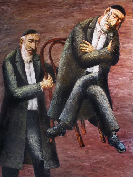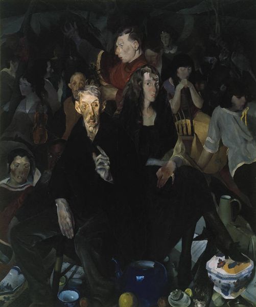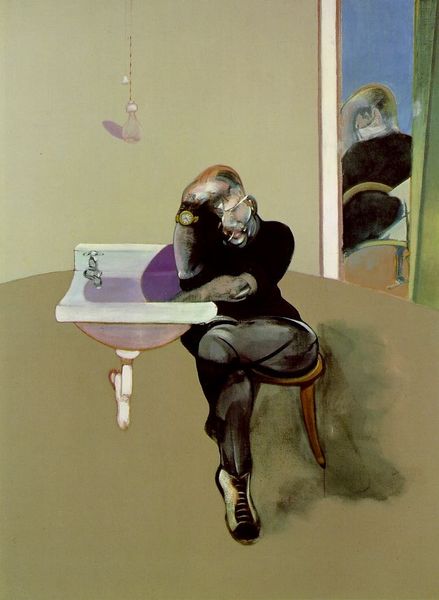 Editor: This is Lucian Freud’s "Reflection with Two Children (Self-Portrait)," painted in 1965 using oil paint. I'm struck by how raw and unflattering the figures are rendered. What do you see in this piece beyond just the depiction of the figures? Curator: I’m interested in the materiality itself. Look at the thick application of paint, almost sculptural. Notice how Freud builds up layers, revealing and concealing, creating a tangible sense of the passage of time and labor. Think about what he's *doing* with the oil paint. Does the somewhat muted palette connect it to something from the era of its creation? Editor: It feels very intentional, as though he wants us to focus on the physical process of making the painting, the labour. That's really interesting. What’s the social context for using this almost brutal style for a portrait of his family? Curator: Consider post-war Britain. There’s a rawness and disillusionment. Traditional portraiture, often commissioned by the elite, is being challenged. Freud’s work disrupts those conventions. His emphasis shifts towards the unvarnished reality of the everyday, utilizing the materials in a new way to present a vision rooted in the common man and anxieties present within contemporary society, challenging our assumptions of art. What is labor to the sitter versus labor to the maker? Editor: So, by focusing on the material and the act of painting, Freud reflects a broader societal shift, away from idealization, towards a grittier view of life. Thank you! Curator: Indeed! It changes how we perceive not only the subjects, but the means by which that perception is created and consumed.