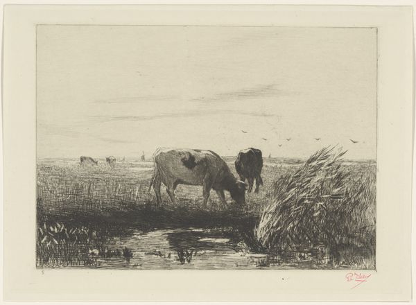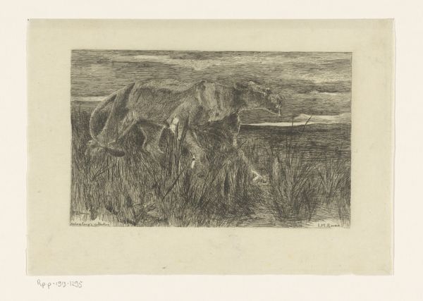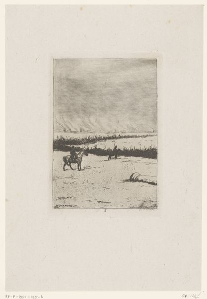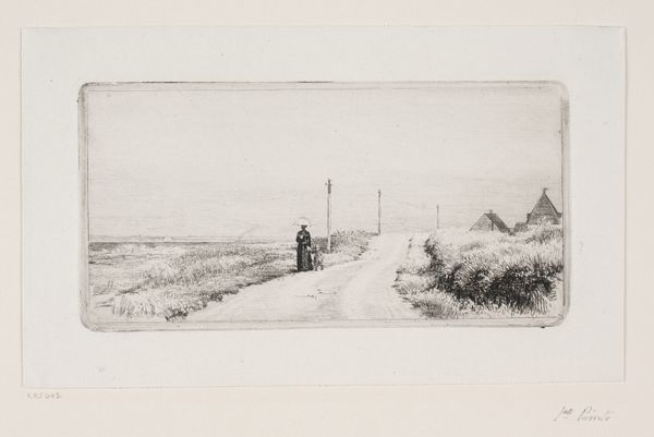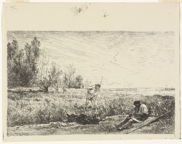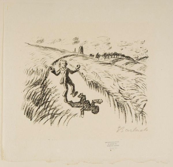 Curator: This drawing by Oscar Andersen is an illustration for "Jeppe paa Bjerget," dating from between 1848 and 1907. It's rendered in pencil and ink. The original is held at the SMK, the National Gallery of Denmark. Editor: The scene has an almost dreamlike quality to it. The figures emerge from a wispy, tall-grassed landscape, almost like they're materializing from the subconscious. Curator: It’s a study of a pivotal scene, drawing on Ludvig Holberg's famous play, a cornerstone of Danish theatre and social critique. Note how Andersen captures the protagonist Jeppe's disoriented state. He is a peasant, tricked into believing he’s a nobleman, the victim of a cruel joke perpetrated by the baron. Editor: Exactly! The Baron and his cronies surround him, as Jeppe stumbles out with his arms wide open, as if expecting a warm welcome; in reality he will soon return to the muck and mire whence he came. Look how the symbols of aristocracy clash with the simple setting. Curator: Absolutely. Andersen is critiquing power structures and the arbitrary nature of social status. The very act of placing a peasant in noble attire underscores the absurdity of inherent privilege. And Andersen was invested in highlighting these themes. This era in Denmark was marked by significant social and political change, particularly debates surrounding class and societal structures. Editor: And note the recurring symbol of the open field – a wild landscape can be read as a metaphor for untamed desires and freedom beyond social codes, as an emotional terrain. The horizon almost dissolves – is there a town there, a castle? – blending reality with imagination. Curator: It does raise a question about the institutions of power – are they firmly in place, or are they subject to the same "dream" that afflicts Jeppe? Andersen is using visual language to express these doubts about societal hierarchies during his time. Editor: So it becomes less about one specific moment in the narrative and more about the symbolic weight carried by its protagonist within the social hierarchy of its time. Curator: Precisely. This small illustration resonates far beyond its immediate depiction of a theatrical scene, reflecting broader societal tensions. Editor: Seeing this artwork provides an emotional connection with a play that still reverberates today.