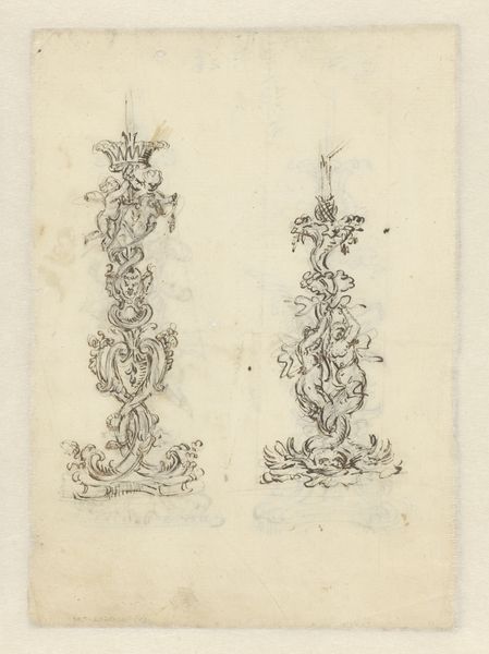 Filippo Juvarra rendered these two grand candelabra designs with pen and ink. Observe how the artist has imbued the candelabras with symbolic weight, particularly through the recurring motif of the putto. These figures, often associated with divine love and innocence, have roots stretching back to ancient Roman art, where they were known as "amoretti." Juvarra reinterprets this symbol, placing it atop the candelabra, thereby elevating the light it holds. This echoes the classical use of putti in Renaissance art, where they signify spiritual illumination and guidance. Consider the dolphin intertwined with the putto on the left candelabra. The dolphin, an ancient symbol of salvation and transformation, appears alongside the putto, perhaps suggesting a deeper, subconscious longing for purity and renewal. This combination evokes a powerful emotional response, engaging us in a symbolic dance that transcends time. The cyclical progression of the putto motif underscores its endurance, revealing how symbols evolve and resurface, laden with new meanings across historical epochs.