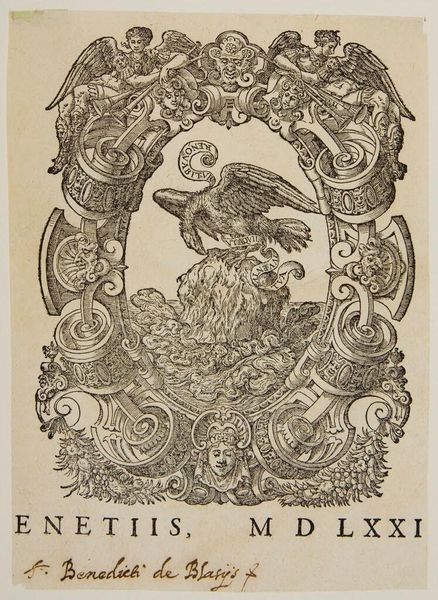 Editor: This is an anonymous print, titled "Printer's Mark", housed here at the Harvard Art Museums. It is so intricate! I am struck by the composition; it seems to adhere to a clear vertical axis, but the swirling forms create a dynamic tension. What elements stand out to you? Curator: The density of the etching creates a fascinating interplay of light and shadow. Note how the artist uses line variation to define form and texture, guiding the eye through the complexities of the composition. Observe the strategic placement of symbolic elements. How do these visual devices affect your understanding of the artwork? Editor: The balanced composition and symmetry lend it a sense of formal authority, yet there are also playful details, like the figures in the side frames, and the wild cat at the bottom. Curator: Indeed. The juxtaposition of those forms is crucial to understanding the whole. Notice the central eagle motif and the banner wrapped around it. The interplay of text and image is a powerful and meaningful element. Editor: I see that now! Thanks for pointing out how the different levels and sections fit together. Curator: My pleasure.