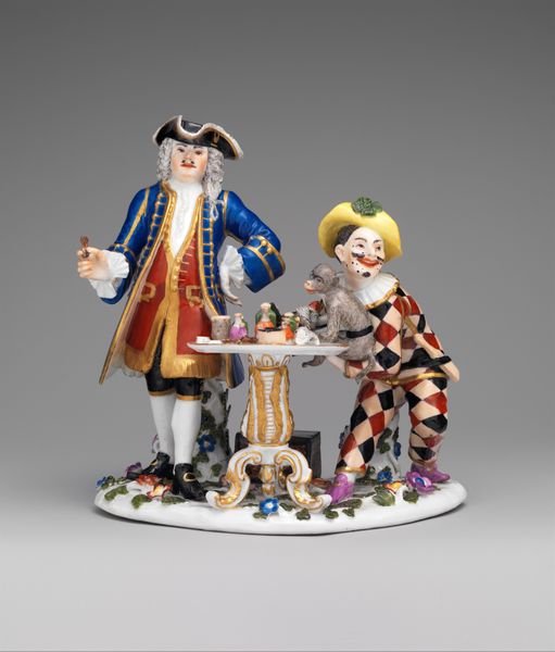 Editor: Here we have “Drum Bearer for the Monkey Band,” made around 1765 by the Meissen Porcelain Manufactory. These little porcelain figures, well, they're whimsical, even absurd! What do you see in this piece? Curator: Beyond the playful Rococo aesthetic, it's vital to consider the societal context. These figurines participate in a long and complex history of representing marginalized groups as figures of entertainment and subversion. We need to ask: what is the nature of that humor, and at whose expense does it function? Editor: I see, it’s not simply playful, but rather potentially loaded. Curator: Precisely. “Singeries,” these depictions of monkeys in human dress and activities, were fashionable. But consider this: are these figurines merely humorous decorations, or do they reflect broader societal anxieties about class, privilege, and the perceived natural order? Are these figures holding up a mirror to the viewers and, if so, what are they reflecting back? Editor: So, you're suggesting it’s a commentary on society… perhaps even poking fun at the aristocracy? Curator: Perhaps. The monkeys are mimicking the fashions and musical tastes of the time. Does that suggest a critique of aristocratic decadence? Or does it further dehumanize already marginalized people by drawing parallels to primates? Remember, Enlightenment ideas were circulating, yet colonial exploitation was also intensifying. These objects exist within that contradiction. Editor: This really complicates my initial view of it as just being “cute.” Now, I see the figures raise more questions than they answer. Curator: Indeed. Analyzing the Drum Bearer compels us to confront uncomfortable histories of power, representation, and the ongoing reverberations of colonialism within our cultural institutions. It reminds us of the responsibility to look beneath the surface and examine the narratives embedded in these seemingly innocent objects. Editor: Thank you. I'll definitely look at other pieces from that period differently now!