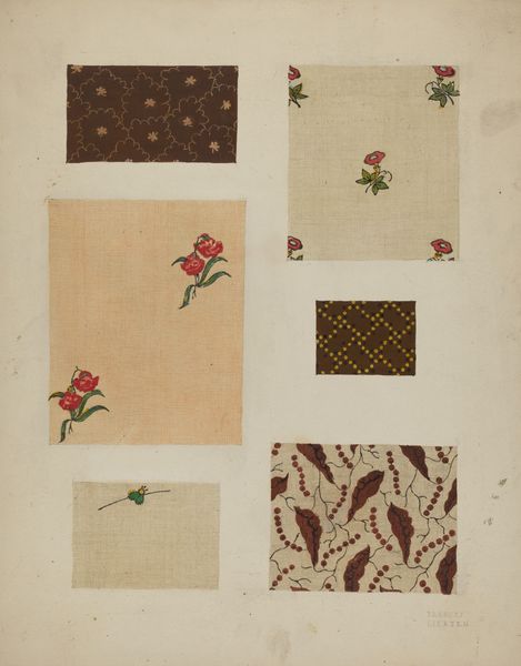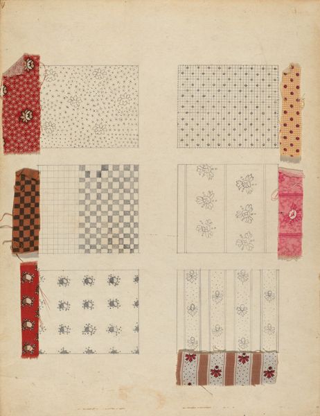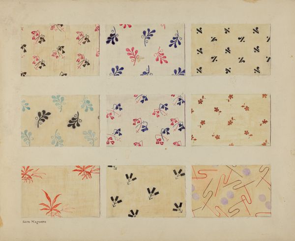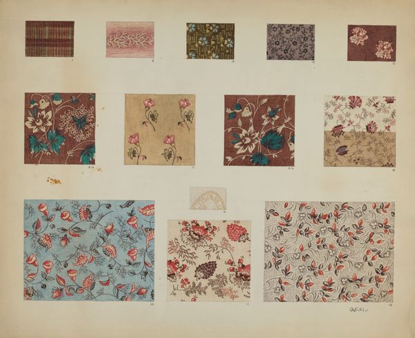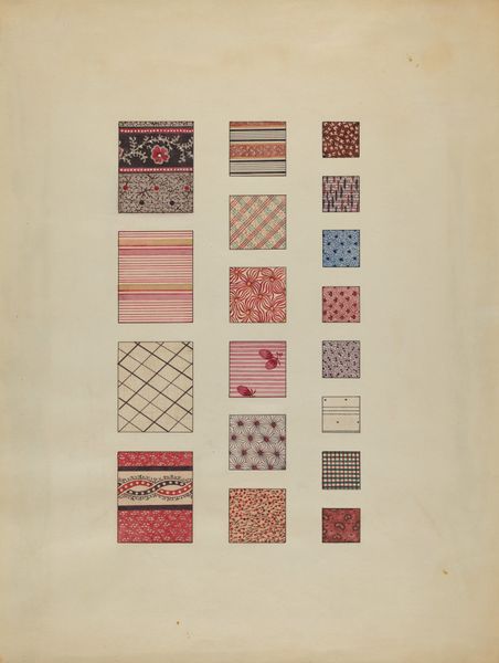 Curator: This watercolor rendering of a Patchwork Quilt by Henry Granet from around 1938 is simply charming. What's your immediate take on it? Editor: It's a curious homage, isn't it? Taking the humblest of domestic crafts and elevating it through...watercolor? It feels almost reverent. Curator: Reverent is a lovely word for it. Granet has lovingly rendered these individual fabric swatches, hasn't he? Each with its own unique pattern and colour story. Editor: Indeed. The process of quilt-making, often communal, often borne out of necessity... here, the artist abstracts it, capturing remnants, scraps... almost like the fragmented memories within the larger cultural project. Curator: You see the hand of history there, I think. But I also see a pure joy in pattern, a real delight in how colors play off one another. Editor: Certainly. The materiality itself is abstracted though, right? He replaces thread with pigment, fabric texture with the sheen of the paper, labor-intensive creation with an artistic gesture. What gets privileged here is the image *of* craft, and less the actual tactile, useful product. Curator: That’s a crucial point. Maybe he’s showing us that even the humblest objects are worthy of artistic consideration. It’s about seeing beauty everywhere, transforming everyday materials and acts. Editor: It feels almost like early conceptualism when put that way. Highlighting not necessarily the ‘what’ but more emphatically the ‘how.’ The ready-made made-ready via re-presentation. What about its original function? Was it merely intended for purely decorative ends? A gift? Or simply a catalog entry? Curator: Perhaps a record of quilts that were made or patterns that were popular? Maybe even a design proposal? This work serves as a reminder that value isn't confined to grand gestures. Editor: Precisely, this watercolour, delicate as it seems, serves as a reminder of those material processes of domesticity and how its production can mirror a larger conversation regarding worth.