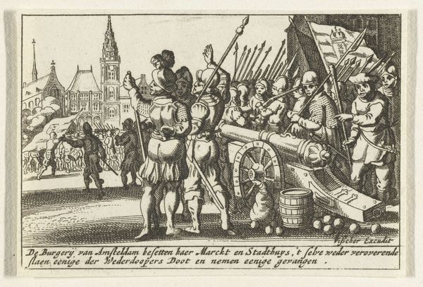 Curator: This engraving, likely produced sometime between 1618 and 1624, is titled "Wreedheden te Rotterdam, 1572", which translates to "Atrocities in Rotterdam, 1572". Editor: Goodness, it’s a rather grim scene. A chaotic dance of bodies—some upright, some… not so much. It feels staged, like a macabre theatre production, with that jeering audience of soldiers in the background. Curator: Indeed. This print, etched by an anonymous hand, offers a glimpse into the tumultuous history of the early Dutch revolt. Observe the level of detail achieved solely through the method of engraving, creating such depth with dense cross-hatching. Notice also how the violence plays out against the clean architectural lines and carefully placed figures in the composition. Editor: What I find so compelling is the stark contrast between the rigid formality of the soldiers and the messy reality of violence enacted in the foreground. The artist obviously aimed to display what the impact of such action might be on both the immediate victims and broader public society. Look at those textures. They bring you into the grit and dirt, as well as provide great technical and representational information regarding military uniforms. Curator: It certainly highlights the cold, detached efficiency of the oppressor. The print uses clear and precise linework to portray the horrors inflicted upon the citizens. The contrast between light and shadow dramatizes the scene, adding emotional intensity. Editor: Engravings like this served as a powerful tool of propaganda. Their relative ease of production meant these could quickly reach a wide audience and further enrage an oppressed people into organized revolt. It asks us to engage and confront questions of authority, obedience, and the potential consequences of conflict on human lives, both past and present. Curator: Reflecting on the print, I’m struck by how it reminds us of art's ability to both record history and shape public perception. It reminds us how violence often casts a long shadow. Editor: Yes, indeed. Beyond aesthetics, “Atrocities in Rotterdam” speaks of our intrinsic responsibility, and the powerful intersection of art and resistance to injustice.