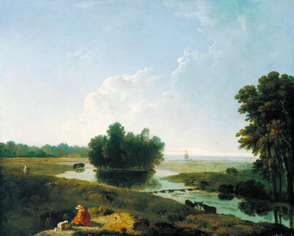 Curator: This is George Lambert’s “View of Copped Hall in Essex, from across the Lake,” painted sometime before his death in 1765. Editor: It’s lovely, but instantly imposing. The way the artist positions the Hall, centered and elevated, evokes a distinct sense of power and dominion. Curator: Notice the composition: the careful balance of light and shadow, the way Lambert uses the trees as framing devices to guide the eye. The very structure emphasizes a hierarchy of vision, doesn’t it? Editor: Precisely. And what is emphasized is the dominance of the landed gentry. The figures in the foreground appear almost incidental, their lives dictated by the economic realities of this estate. Curator: Yet, there is a serene formality here. The texture of the paint, the brushstrokes creating a palpable sense of depth—a structured and organized vision. Editor: That organization serves to naturalize what is, in effect, a constructed social order. The picturesque hides the politics. Curator: A tension, then, between idealized beauty and social critique? Editor: I think that's an important part of understanding this landscape, yes. Curator: Food for thought indeed.