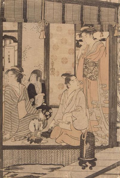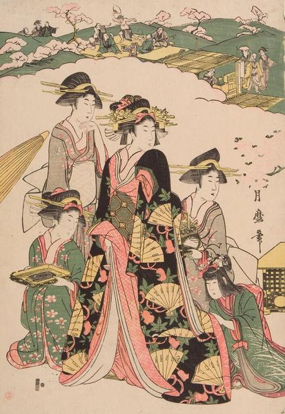 Curator: This is Torii Kiyonaga's "DÅgashima", from his series, "Seven Noted Hot Springs in Hakone." Kiyonaga was born in 1752 and died in 1815. Editor: The women seem utterly unbothered, a serene scene. The bridge is this lovely vermillion, juxtaposed against the pale wash of their kimonos. Curator: Look at the texture Kiyonaga achieves! The paper itself has a palpable presence. You can almost feel the woodblocks pressing ink into the fibers. Editor: The whole act of consuming tea, usually an act of refinement, rendered as labour? It’s about the social practice, the means by which leisure is achieved. Curator: Yes, and Kiyonaga elevates these women. Are they workers, are they patrons? The liminal space offers a moment of calm reflection. Editor: A fascinating dialogue between the individual and the broader societal mechanics at play. Curator: An enduring snapshot, indeed, offering a small window into another world.