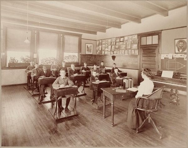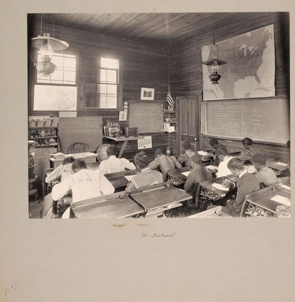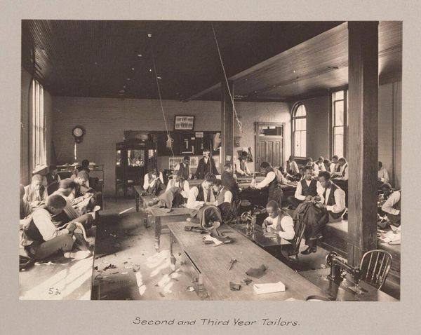 Editor: This photograph, "Defectives, Feeble-minded: United States. Massachusetts. Waverly. School for Feeble-minded" by William A. Webster, shows a classroom of students. I’m immediately struck by the stark contrast between the formal setting and the seemingly playful activity with the map on the floor. What can we tell about this work by examining its materials? Curator: Well, the photographic process itself is key. Consider the labor involved in creating this image, the chemicals, the darkroom, the printing. This was a carefully constructed image, not just a snapshot. What’s being produced here isn’t just a photograph; it’s a representation of a specific social agenda. Editor: Social agenda? You mean the way the image is composed, the setting, it's all deliberate? Curator: Precisely. The materiality speaks volumes about how these individuals were perceived and treated within the system of the time. It’s a commodity produced to reinforce certain societal views. Editor: So, understanding the materials and methods helps us unpack the social and political context of the photograph. I hadn't considered that before. Curator: Exactly. Every choice, from the photographic process to the setting, contributes to the message being conveyed.