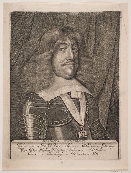 Editor: We’re looking at “Frederik III,” an engraving made sometime between 1655 and 1659 by Albert Haelwegh. It’s a portrait, of course, but what strikes me is the weight of the armour against the softness of his hair. How do you interpret that contrast? Curator: It's interesting, isn't it? Think of the portrait as theater. Haelwegh’s subject is literally playing the part of the strong and capable leader: steel armor for protection, long flowing locks signifying wealth and status. But the man underneath? That’s for us to imagine. He almost seems aware of the performance, wouldn't you say? Editor: You’re right, there's a sense of self-awareness in his eyes, perhaps even a touch of melancholy. And what about that Order of the Elephant medal? Curator: Oh, the elephant! Denmark’s highest order. A symbol of strength, wisdom, and temperance, everything a good ruler should be. Although, ironically, Frederick III wasn’t particularly known for his temperance. History paints him as a shrewd politician, willing to bend the rules to consolidate power. So, does the elephant tell the whole story? I wonder. Editor: So the portrait presents an ideal versus reality? Almost like propaganda? Curator: Exactly! Art serving power, or at least attempting to. That tension, that gap between image and reality, is what makes portraits like this so fascinating to me. Editor: I never considered the art as separate from the reality of the ruler. This really sheds a new light on historical portraits for me! Curator: I agree, viewing a portrait not just as representation, but as a conversation, I hope can offer many future students something interesting to investigate.