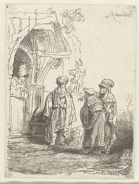 Abraham was deeply interesting to Rembrandt, who returned to the subject throughout his career. Here Abraham (at far right) ministers to three travelers, extending every hospitality his 99 years will allow. Led by a rotund, turbaned figure of God, the trio brings a surprising message: Abraham and his aged wife, Sarah, will have a child. Listening in the doorway, the old woman is amazed. Rembrandt departed from Genesis 18 by including Ishmael, Abraham's son born of the servant Hagar. Facing the wilderness with his bow, the boy will soon be exiled, yet live to become patriarch of the Ishmaelites—identified by some as forebears of the Islamic nations. Rembrandt's print may function, then, to suggest a common ground among various faiths born of the same father, Abraham.