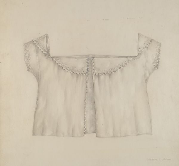Curator: Before us we have Eugene Croe’s "Chemise," created around 1936. It's a pencil drawing on what appears to be toned paper. A domestic item rendered with care... Editor: It has a gentle, almost ghostly quality. The soft lines and muted tones evoke a sense of quiet intimacy. I almost feel like I’m looking at a cherished heirloom, something imbued with personal history and vulnerability. Curator: Indeed. Croe seems particularly attentive to the lace and the details of the embroidery—the artist is meticulously cataloging and recording not just an item of clothing, but the visual language of a bygone era. Notice how the pencil work mimics the delicate texture. Editor: That focus on texture underscores the garment's place within a very specific material reality. Nightclothes historically index a very coded space of femininity. This garment probably belonged to someone and it’s difficult to miss that absent figure. Curator: And the monogram on the chemise could give a key to a particular family memory or genealogy if we knew more. The artist draws attention to those symbols of belonging. Are we meant to ponder who wore this and their relationship to this very personal and intimate belonging? Editor: Definitely. Moreover, Croe's choice of chemise speaks to historical constructs around domesticity and privacy—chemise represents woman's space within the home, yet the act of drawing calls it outside it again into a social arena. It's not an idealized vision; the very medium indicates modesty, the intimate made public. Curator: The everyday is imbued with symbolic resonance. A garment holds the shape of the person. I can see continuity and persistence of visual emblems of comfort, care, protection even. Editor: Perhaps Croe wanted us to ponder such a legacy. How objects tie to historical narratives as well as lived moments, how they speak when witnesses can't. I like to think this little scene of clothing holds so many stories waiting to be unraveled. Curator: It offers itself as both evidence and symbol—to be considered with care and concern.