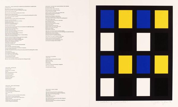 Editor: Here we have Ian Tyson's "Making a Garden," an illustration from his ‘Folio 6, Dances 30-35’ series. The neat grid of colorful rectangles feels playful, almost like a child's building blocks. What do you make of this ordered arrangement, seemingly titled "Making a Garden"? Curator: Well, "making" implies an action, a becoming. And what is a garden but a controlled wildness? It's the tension between that grid, those blocks of strict color, and the implied organic chaos. It reminds me of Mondrian, but with a wink. Editor: Mondrian for gardeners, maybe? Curator: Exactly! Perhaps Tyson's inviting us to find the art in the everyday, in the act of cultivating, pruning… even in something as seemingly simple as arranging colored squares. It’s strangely poetic, don't you think? Editor: I guess so. It does make me think differently about what art can be.