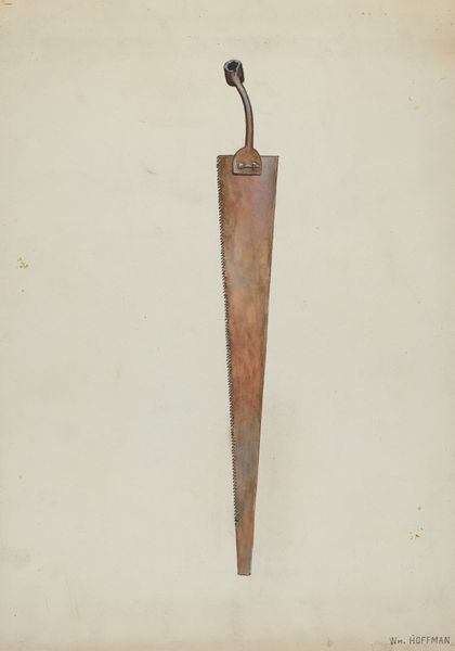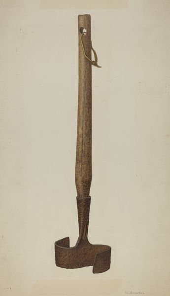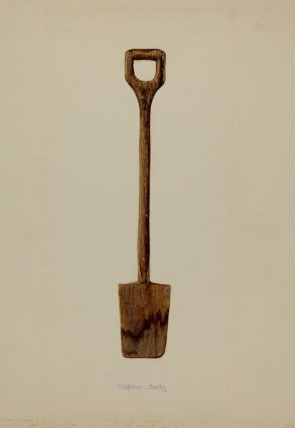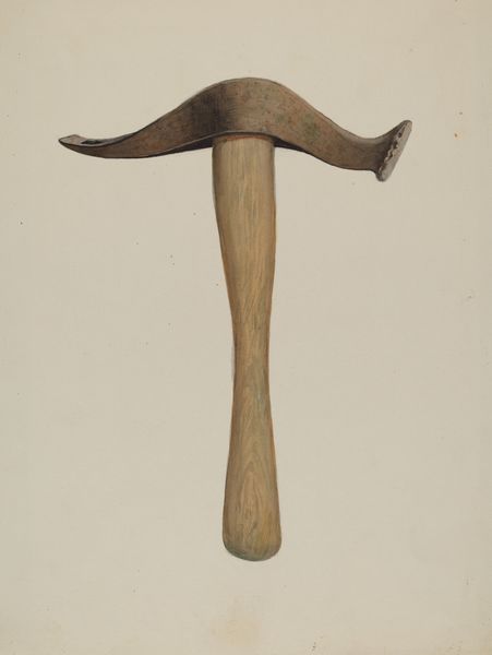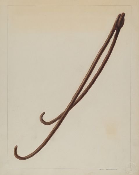 Editor: We’re looking at "Rain Gutter Stirrup," a 1939 watercolor and pencil drawing by Harold Ballard. It’s surprisingly… compelling, considering it’s just a single metal object. The color palette is muted and industrial, and there's an interesting tension between its function and Ballard's almost reverent depiction. What do you see in this piece? Curator: This humble stirrup, rendered with such care, becomes more than just a utilitarian object. It embodies the spirit of a particular era. Think about 1939. On the brink of immense global upheaval, there's a quiet dignity in focusing on the commonplace. The rust and wear become symbols of endurance. Doesn’t it feel almost talismanic? Editor: Talismanic… like a good luck charm? Curator: Perhaps not good luck exactly, but an emblem of resilience. The geometric simplicity—the hook against the toned paper—evokes a kind of honest labor, the forgotten backbone of everyday life. Notice the watercolor’s almost photographic realism. Do you think this precise depiction reinforces the object's inherent truth? Editor: I see what you mean. The precision gives it weight. I hadn’t considered how it spoke to the era it was made in, more generally to the pre-war anxiety through humble imagery, even the passing of time in the object's rusted surface. Curator: Precisely! It makes us contemplate our own relationship with discarded things, the symbols they unknowingly accumulate, and what they might say about us to future generations. This object has been captured as a piece of material culture, speaking volumes about the past through careful study. Editor: That’s given me a new appreciation for what seems simple at first glance! The beauty in the mundane really stands out now.