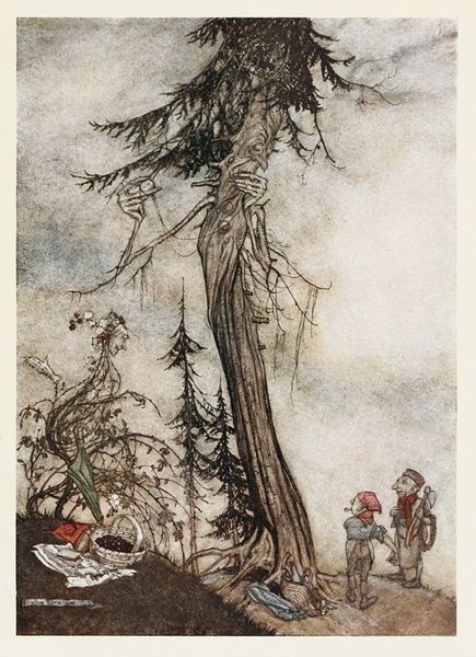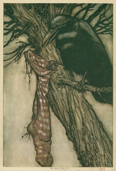 Editor: So, here we have "Why, Mary Ann, what are you doing out here" by Arthur Rackham, in ink and drawing on paper. There’s such a dreamy quality to the line work, almost unsettling. What is your interpretation of this piece? Curator: Well, on one level it's an illustration from Alice in Wonderland, part of the broader cultural fascination with childhood innocence during that era. But I’m particularly struck by the rabbit figure. What power dynamics do you see reflected in a humanized animal interacting with a young girl in this natural setting? Editor: That's interesting, because I hadn't considered it in the context of power dynamics, more like a classic fairy tale setting. But now that you mention it, his dress does evoke certain social hierarchies. Curator: Exactly. Rackham was working at a time when Victorian social structures were starting to be questioned, and artists often used fantasy to explore anxieties about class and gender. Think about how Alice, though seemingly innocent, challenges established rules through her journey. Does the natural world seem welcoming here? Editor: Not really. It’s dark, a little overgrown and foreboding. Curator: And in that darkness, Rackham offers a symbolic space to reimagine social constraints and question dominant ideologies. What kind of conversation does this spark when you consider similar issues in our present? Editor: Wow, I never considered it that way. Now it feels much more than just a fantastical illustration, it is social commentary. Curator: Absolutely! By analyzing these kinds of images, we learn so much about the historical contexts in which they are created, and the dialogues about society that have been happening across generations.