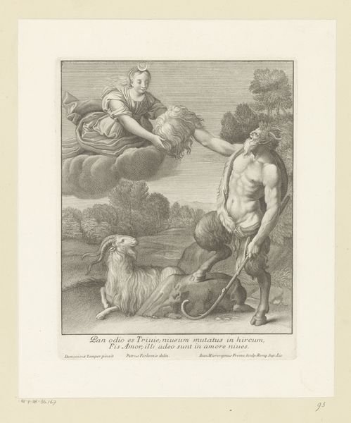 Curator: At first glance, it’s stark, but there’s a quiet intensity. It’s like a whisper in monochrome, you know? Makes you lean in to hear its secrets. Editor: This is "Christus verschijnt aan Maria Magdalena," or "Christ Appearing to Mary Magdalene," an etching dating from about 1720-1728, now residing here at the Rijksmuseum. It's attributed to Willem de Broen. What strikes me is how de Broen captures a historical interpretation, the staging of this pivotal biblical encounter. Curator: Staging is right. I mean, look at the garden setting! Feels almost like a theater backdrop. Gives it this slightly surreal, dreamlike quality. Makes me wonder about Mary’s emotional state—absolute vulnerability and astonishment. Editor: Absolutely. The use of landscape to enhance narrative was common. Note the careful positioning, drawing parallels with power dynamics and the architecture’s influence on perceived sanctity. And of course, let’s remember that prints like these were often disseminated widely, carrying socio-religious messages across geographic boundaries. Curator: It's interesting that he isn't wielding authority in this moment, but it seems very intimate, like a private reveal amidst the public face of it all. This raw humanity in what's fundamentally a story of faith – that's what grabs me. And this aged paper! Feels like holding history. Editor: Its condition does reflect the passage of time and modes of display and collecting; aspects which subtly shift our perspective when understanding art’s public life. Beyond its beauty, consider it as a artifact carrying stories of faith and society's gaze. Curator: Exactly, because while the paper and ink are still here telling the tale, the artwork goes way beyond its appearance; it almost comes to life through its journey. It is as if, in gazing, it gazed back. Editor: Yes. In that way, we can truly observe that we too now add to the narrative, giving it breath and allowing that initial aim—communicating belief—to live on.