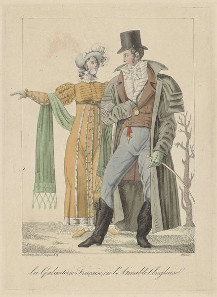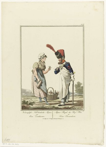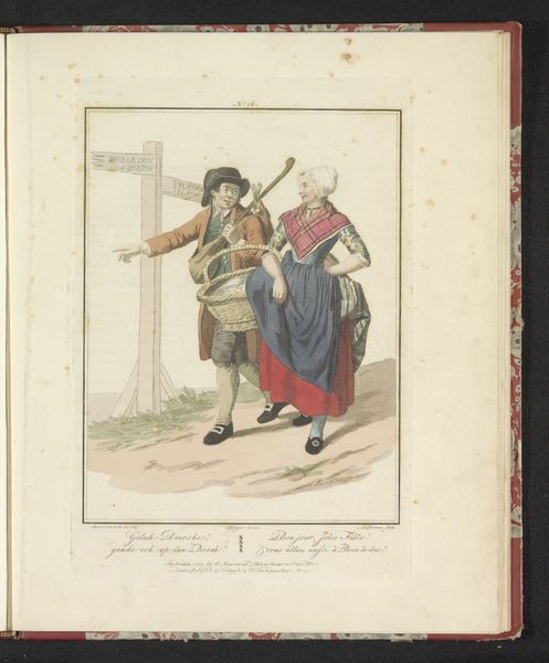 Curator: Ludwig Gottlieb Portman painted this between 1803 and 1807; it's titled "Brabantse Boer en Boerin." Editor: Hmm. First impression? Rural simplicity, perhaps a touch romanticized. The colors are muted, but they pop against the neutral background. It has an innocence, a kind of naive charm. Curator: Interesting. Naive charm, indeed. Portman was really capturing the essence of daily life here. It almost feels like he bumped into them on his travels and decided, yes, these two need to be immortalized on paper. Editor: There's an undeniable performative aspect. Look at the positioning – she’s posed, really pushing out her hips. It calls attention to her waist, especially with her hands on her hips. The lines of the bodies create a sense of upward, almost childlike enthusiasm that is heightened with their wide eyes and raised eyebrow expression. What really hits me, though, is the lack of depth. It's flat, almost like a theatrical backdrop. Curator: Exactly! That backdrop, you're right, helps throw the pair into sharp focus. Consider it – genre painting and romanticism coming together like they were on a blind date! It's really something how the signage points to different locations in an attempt to invite a reading of the art that pushes it beyond the portrait. But ultimately it keeps returning to these figures. I mean, you see that guy with the basket? I can practically smell the freshly baked bread inside! Editor: Maybe. It has to do with the coloring, and the slight imperfections. The execution lends itself to the scene rather than distract. It does remind you of being outside and amongst that world. But to take us back to what I was initially pointing at, if Portman intended realism, it feels almost dreamlike—enhanced but fundamentally unreal. It could be an allegory; a semiotic dance about rurality, with no one willing to be honest about the nature of work itself! Curator: A semiotic dance! I like that! It's like we're crashing their very posed picnic. Ultimately it feels like this piece does an excellent job of inviting the viewer to ask "what is reality?" when assessing these romantic themes. Editor: So there's the rural folk on the road, beckoning us with bread baskets and a sly smile. Quite the day. Curator: Indubitably! A brief but tantalizing moment with these characters. I feel that it gives an insight that invites one to feel good for them.