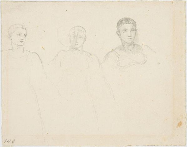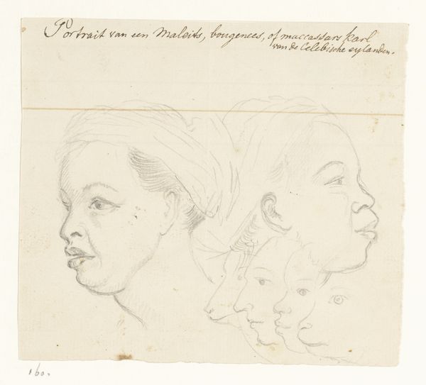 Editor: This is John Varley's "Sketch for ‘Treatise on Zodiacal Physiognomy’" from the Tate Collections. It's fascinating to see these different profiles sketched out. What stands out to you in terms of the composition of this work? Curator: The arrangement of the faces invites a comparative reading. Note the variations in line weight, creating a hierarchy of forms. The subtle gradations in shading suggest an attempt to capture underlying bone structure. Editor: So, the structure here isn't just about the faces themselves, but also how Varley uses line and tone to create a visual order? Curator: Precisely. Consider, too, the inscription to the side; it seems to be part of the study of human form that Varley is invested in. Editor: I see what you mean. Thanks for illuminating the structural elements and Varley's inscription. Curator: My pleasure. Paying attention to structure sharpens our interpretation.