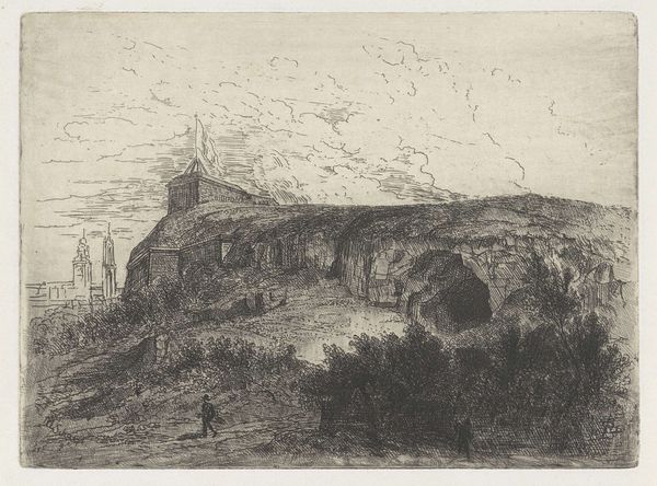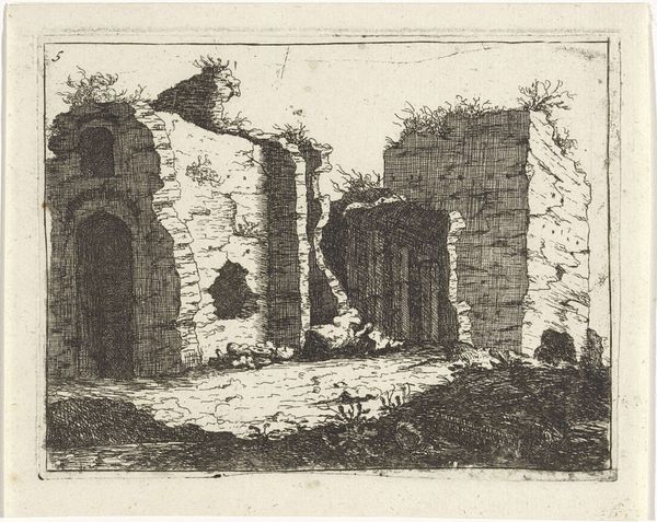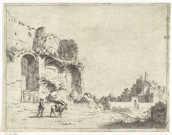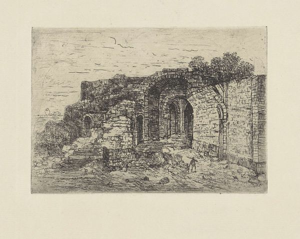 Curator: Welcome. We're standing before Willem Matthias Jan van Dielen's "Zuidelijk landschap met ruïne en herder met vee," created between 1815 and 1867. It's a captivating etching. Editor: My immediate reaction is one of solitude and perhaps melancholy. The stark contrast of light and shadow, combined with the crumbling ruins, evokes a sense of time passing. Curator: Indeed. Van Dielen employs etching to masterfully convey a landscape steeped in historical context. We see a ruined building in what appears to be a classical style—the arches, the suggestion of a once-grand structure. Editor: Note how the use of line creates depth and texture. The density of the marks, particularly in the foreground and the ruins themselves, makes them seem almost tactile. It gives them physical weight. Curator: Absolutely. And the contrast in line quality, from the rough, hurried marks delineating the vegetation to the finer, more deliberate strokes defining the architecture, highlights the scene's inherent tension between nature and culture. This aesthetic resonates with the Romanesque movement and its interest in historical and landscape subjects. Editor: The presence of the herder and his livestock is critical; it grounds the grand ruin within a cycle of daily life and the natural world. In light of sociopolitical movements in Europe and a newfound interest in historical societies during this period, pastoral imagery was being politicized as representing a more "pure," or localized cultural identity. Curator: Precisely. And that subtle interplay creates an allegory where both pastoral and historical elements converge. Note, too, how the eye is drawn into the composition through the apertures and into imagined realms of the former structure. Editor: I find the size fascinating as well, knowing this is an etching it provides an intimacy with such expansive themes. Curator: The artist provides not just a picture, but a carefully constructed commentary on how people build worlds that rise and fall. And we now engage with its echo through his art. Editor: Reflecting on this piece, the ruin isn't just a fragment of a building, it represents the layers of time. Its haunting beauty persists as we observe, bearing testament to history and natural forces.