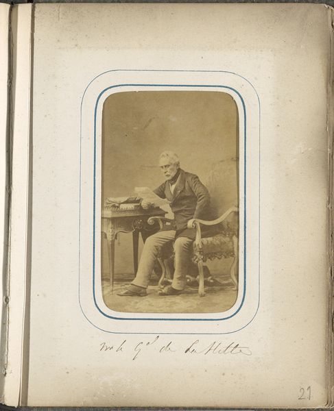 Curator: Here we have "Portret van generaal graaf De la Rue," a portrait made by Mayer & Pierson, dating back to about 1860 to 1865. It's an albumen print, a type of photography common in the 19th century. Editor: There’s a quiet strength about this portrait, wouldn't you say? The tones of the print itself lend a certain gravity to the image of the general. And you can see a masterful control over the materials, how the light and shadow emphasize his face and uniform. Curator: Indeed. It’s hard to separate the image from its historical context. This was a period of considerable social and political upheaval, not just in Europe, but globally. How does his pose and attire serve as markers of power, especially within a militaristic framework? The military uniform, down to its construction, speaks to a highly regulated system. Editor: Exactly, the uniform *is* the art, in a sense. Consider the labor involved—the precise tailoring, the materials sourced, the societal pressures for standardization versus individual flair. The gold braids and embellishments aren't merely decorative, they're products of industry. Someone made them. The value and quality were surely linked to the value placed on military service itself. Curator: I agree. And who has access to it; what it means in terms of societal identity to belong to this elite circle is very pertinent. Thinking about the artistic intervention, we need to understand that representation, image-making, in itself, especially photographic portraiture in this period was tied to the consolidation and demonstration of power. Editor: Precisely! The ability to *own* this likeness was still relatively exclusive, it’s worth contemplating the interplay between art as documentation, and as propaganda. How does De la Rue want to be remembered and who is intended to consume his representation? Curator: Thinking about his story, placing him within the narratives of military authority during this epoch allows us a vital means to analyze themes of colonialism, and nationalism. What’s the purpose of displaying, distributing these images and who is the audience of De la Rue's portrait? Editor: A key point to reflect on the context surrounding the materials of photographic prints like this, which allow us to decode more. How they functioned as tools of visual rhetoric to project wealth, dominance and societal class. Curator: So, as we analyze how an image communicates societal standards in history, that image is also, quite literally, materially produced. Editor: An essential insight that makes us reflect on the complex narratives involved.