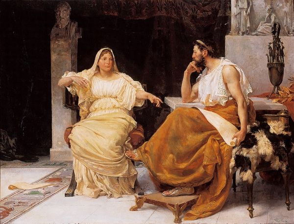 Editor: Here we have John William Waterhouse's *Marianne Leaving the Judgement Seat of Herod*, an oil on canvas painted in 1887. The central figure, Marianne, is descending a set of stairs, looking back at what seems to be Herod's court. The scene feels quite tense, steeped in injustice. What do you see in this painting? Curator: What strikes me is how Waterhouse positions Marianne within a nexus of power and patriarchal judgment. The narrative, drawn from historical accounts, becomes a stage to explore themes of female defiance against oppressive systems. How does her gaze challenge the authority embodied by Herod and his court? Is she a victim or a symbol of resistance? Editor: It’s interesting that you call her a symbol of resistance. Her hands are bound. She seems trapped in the narrative. Curator: Indeed, the chains can be viewed as both literal restraints and metaphorical constraints imposed by a society that seeks to control female agency and autonomy. But consider also her regal bearing, her averted gaze seems to defy Herod. Waterhouse uses her image to speak about broader struggles for women’s emancipation and social justice. Don't you find this contrast significant? Editor: Yes, the contrast between her physical constraint and her dignified posture makes me reconsider my first impression. She's not just a victim. Curator: Exactly. The Pre-Raphaelites often used historical narratives to critique their contemporary society, particularly concerning gender roles and Victorian morality. How does this painting fit within that context? Editor: Now that you mention the historical and social critiques of the Pre-Raphaelites, this piece makes much more sense to me. Curator: Right? It's about bringing art history and contemporary struggles together in a richer and more layered cultural dialogue. Editor: I learned that what appears to be historical can also convey feminist discourse when the artist calls on us to be present. Thank you!