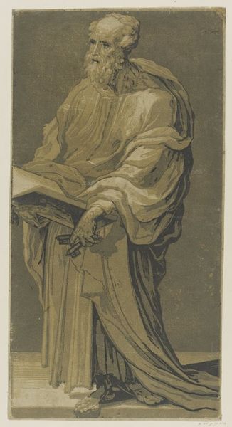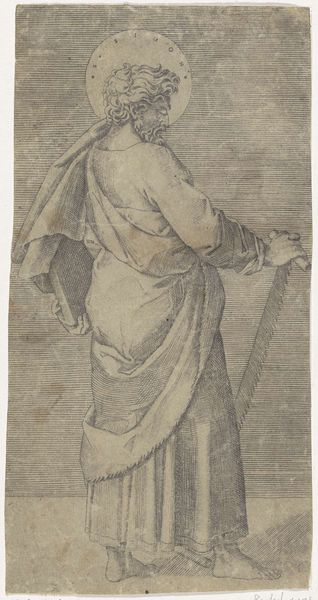 Curator: I’m drawn to the somber tone set by the cross-hatching, which provides so much texture. It gives the work a depth that feels both weighty and spiritual. Editor: Here we have "Saint Bartholomew facing right, book under his right arm, knife in his left hand, from 'Christ and the Apostles'," created between 1543 and 1553 by Andrea Schiavone, or Andrea Meldola. It’s a print, specifically an etching. And your description resonates because it’s making me consider its creation. You see the line work and the way the light catches on the figure; it must have taken some labor and technical mastery. Curator: The knife held by Saint Bartholomew is, of course, incredibly evocative, not only as the instrument of his martyrdom—he was skinned alive, a grisly fate—but also as a symbol of sacrifice. The book under his arm tells a story of cultural memory and continuity. What knowledge does he guard, what texts preserve him and his violent ending? Editor: I can see that. Considering it as an etching though, think about how it's a reproducible medium, allowing for the wider dissemination of these iconic religious figures. What does that suggest? More people across geographic divides being made to grapple with his iconography of sacrifice? How might the original meaning change through material means of reproduction? Curator: Mass reproduction offers an opportunity to keep Saint Bartholomew’s symbolic power active. While, yes, that original meaning may evolve—shifting based on each viewer and socio-political climate, his sacrifice persists. But do we keep this image in the public eye to glorify violence, to create modern martyrs, or as a memento mori? The reading shifts constantly. Editor: Very interesting to think about, and to consider its original functionality too, the labor that went into this process and, potentially, how easily people could engage with Saint Bartholomew given the social context and location of its reproduction. The texture speaks to the hand of the artisan in reproducing this image. It is heavy—I now think in part from a sense of both literal labor and the content of violence we must now confront, even today.