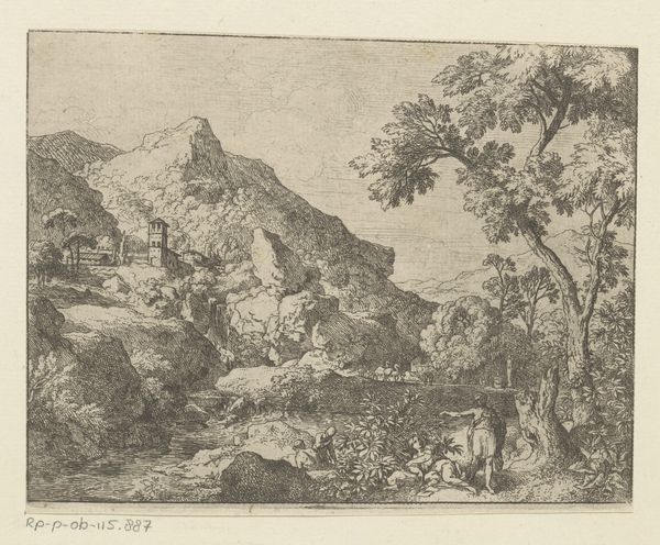 Jan van Aken created this drawing using pen and brown ink with grey wash. It is dominated by the verticality of the mountains and a palette of subdued greys and browns, lending it an air of solemnity. The composition invites us to explore the interplay between natural forms and human presence. Note how the linear quality of the pen work defines the craggy rocks and contrasts with the softer wash used for the sky and distant landscape. The travellers on the road are rendered with delicate strokes, emphasizing their smallness amidst the grandeur of nature. Consider the use of perspective. Aken employs a high viewpoint to offer a wide vista. This draws the viewer's eye from the detailed foreground to the fading background, suggesting the vastness of space. The drawing’s restrained palette and focus on line and form are not just aesthetic choices but also communicate a vision of nature as both powerful and indifferent to human concerns. Ultimately, Aken presents a landscape that invites contemplation on humanity’s place within the larger order of the natural world.