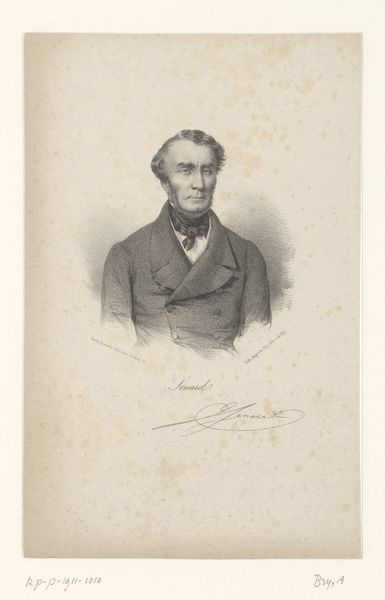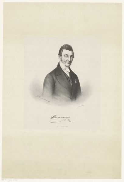 Curator: It’s the pencil work that first strikes me—remarkably detailed and delicate for such a formal portrait. Editor: Indeed. What we're observing here is a pencil drawing from somewhere between 1842 and 1880, titled "Portret van N.J. Hofmeyr." It’s currently held at the Rijksmuseum. Let’s delve into its significance. My first thought is the stark composition reflects the growing role of individual portraits celebrating the burgeoning merchant classes and figures rising in social standing and influence during this time. Curator: It’s interesting you immediately consider the commercial class. I see it as a deeply intimate depiction. Hofmeyr’s pose, hand placed delicately on his chest, speaks to a controlled presentation of self, yet there's also an element of vulnerability there, the almost understated pride reflecting the values and aspirations of a specific social class amidst a period of intense social transformation. The subtle, almost whispered draftsmanship mirrors the evolving notions of bourgeois masculinity. Editor: I understand the sensitivity you point out, but I am also struck by the economic realities of portraiture during this period. Think of the materials: pencil, paper, the labour-intensive act of drawing itself. Each element carries weight within a broader context of production and consumption. Did this commission serve the artist's or patron’s social ambition and to what extent could the material process allow a challenge the established power structures that commissioned such likeness? Curator: That's a crucial consideration. However, let's also consider how Hofmeyr's own identity might intersect with these societal forces. Was he an advocate for or an oppressor in the racial politics of his time? How did his representation reinforce or challenge the power dynamics? We must bring in a multi-dimensional, critical theory lens. Editor: I concede that examining those dynamics of representation is crucial. How did the creation and exhibition of this portrait support colonialist aims or class distinctions? Examining the social life of the work, from artist’s hand to museum wall can open those insights and interpretations. Curator: Exactly. It pushes us to see beyond the surface of the portrait and ask about whose histories and realities are privileged and whose are being suppressed. Editor: So we both land on it offering layers of reflection of artistic labour and material practices in concert with social dynamics reflected and contested through such acts. Curator: A productive intersection, revealing not only the artist’s skill, but also a critical and socially engaged lens to reveal this individual in the wider context of production, class, and ideology.