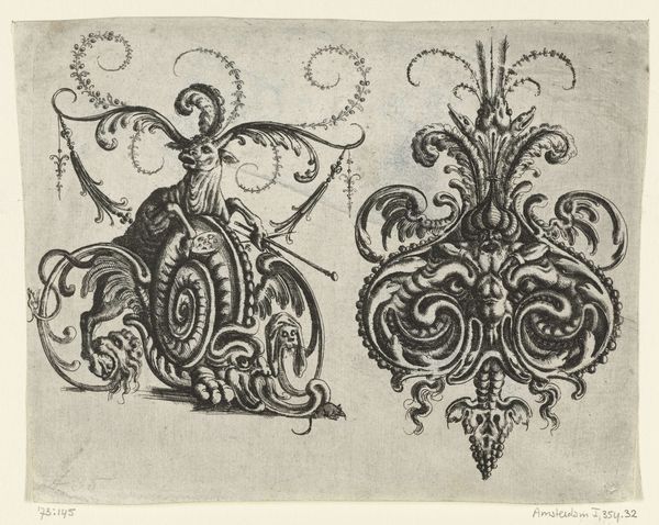 This is a print made by Christoph Jamnitzer, sometime between the late 16th and early 17th century. It's called "Liggende stier met een slakkenhuis als achterlijf," which translates to "Reclining bull with a snail shell as hindquarters." Engraving is a meticulous, labor-intensive process, demanding precision and control. Using a tool called a burin, the artist would incise lines directly into a copper plate, the depth and spacing of which determined the tonality and texture of the final print. The plate would then be inked, and the surface wiped clean, leaving ink only in the engraved lines. Finally, paper was pressed against the plate, transferring the image. This particular print demonstrates Jamnitzer's mastery of the technique, showcasing an intricate design featuring grotesque figures and elaborate ornamentation. It is a virtuoso display, perfectly suited to the highly skilled metalworkers of his era, who would have used prints like this as inspiration for their own creations. It shows that even a utilitarian object can embody tremendous artistry.