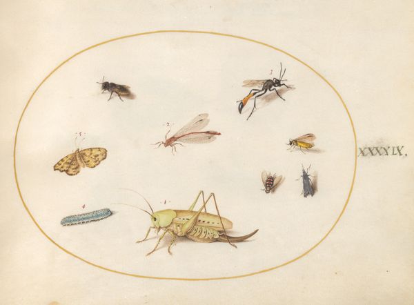 Joris Hoefnagel made this watercolor and gouache painting, Three Grasshoppers, around 1575-1600. Look closely, and you'll see that this isn't just a quick sketch, but a meticulous study. Hoefnagel’s artistry is evident in the fine brushwork, using thin layers of pigment to capture the insect’s delicate structure. Each grasshopper is rendered with incredible detail, showcasing the artist's mastery of observation and painting technique. The colors appear vibrant, and the lines are sharp, suggesting that Hoefnagel prepared his own paints with precision, grinding pigments and mixing them with a binder to achieve the desired consistency and hue. The craftmanship evident in Three Grasshoppers elevates it beyond a mere scientific illustration, showing the value of meticulous making in understanding the world around us.