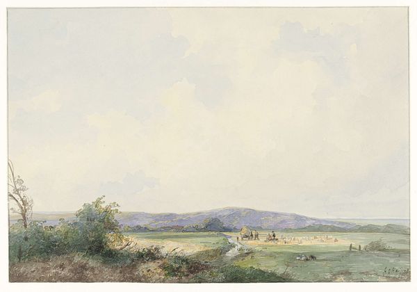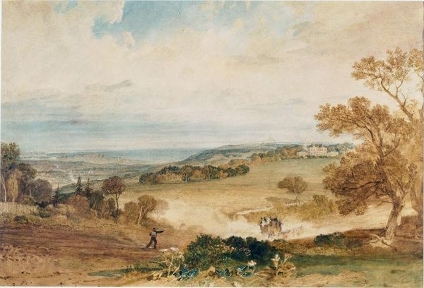 Editor: This is Peter De Wint's "Cornfield, Ivinghoe, Buckinghamshire," a watercolor landscape. The muted tones create a tranquil scene, but there's also a sense of labor depicted in the foreground. What social dynamics might be at play here? Curator: That's a perceptive observation. Consider the Enclosure Acts. They drastically reshaped land ownership, displacing many rural workers. Does this image romanticize rural life, or subtly critique the inequalities of land ownership and labor? Editor: I hadn’t thought about that. So, the seemingly peaceful scene could be masking deeper tensions related to class and access to resources? Curator: Precisely. De Wint's choice of depicting agricultural labor invites us to reflect on the changing social fabric of rural England and who benefits from this landscape. Editor: That adds a whole new layer to how I see this painting. It’s not just a pretty picture, it's a commentary. Curator: Indeed. By questioning what we see, we uncover the powerful dialogues art can have with history and social change.