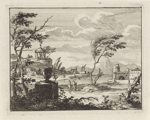 Eberhard Cornelis Rahms created this etching of the entrance to 'Nooit Gedacht' sometime in the 19th century. It's a study in contrasts, where formal, almost rigid architectural lines meet the organic and softer forms of nature. Rahms sets up a visual dichotomy between the constructed and the natural. The gate pillars, adorned with urns, frame a view into a landscape that blurs into the distance with looser, less defined strokes. This contrast is reinforced by the controlled lines of the architecture against the free-flowing lines of the foliage and the softly rendered figures. Consider the semiotic implications of the gate itself. It is a threshold, a boundary between spaces, suggesting a transition from order to nature, or perhaps from the known to the unknown. The play of light and shadow across the scene adds another layer, obscuring certain details while highlighting others, drawing our eye through the composition and deeper into the landscape. This etching doesn't just depict a place, but also invites us to reflect on the very act of seeing and interpreting the world around us.
